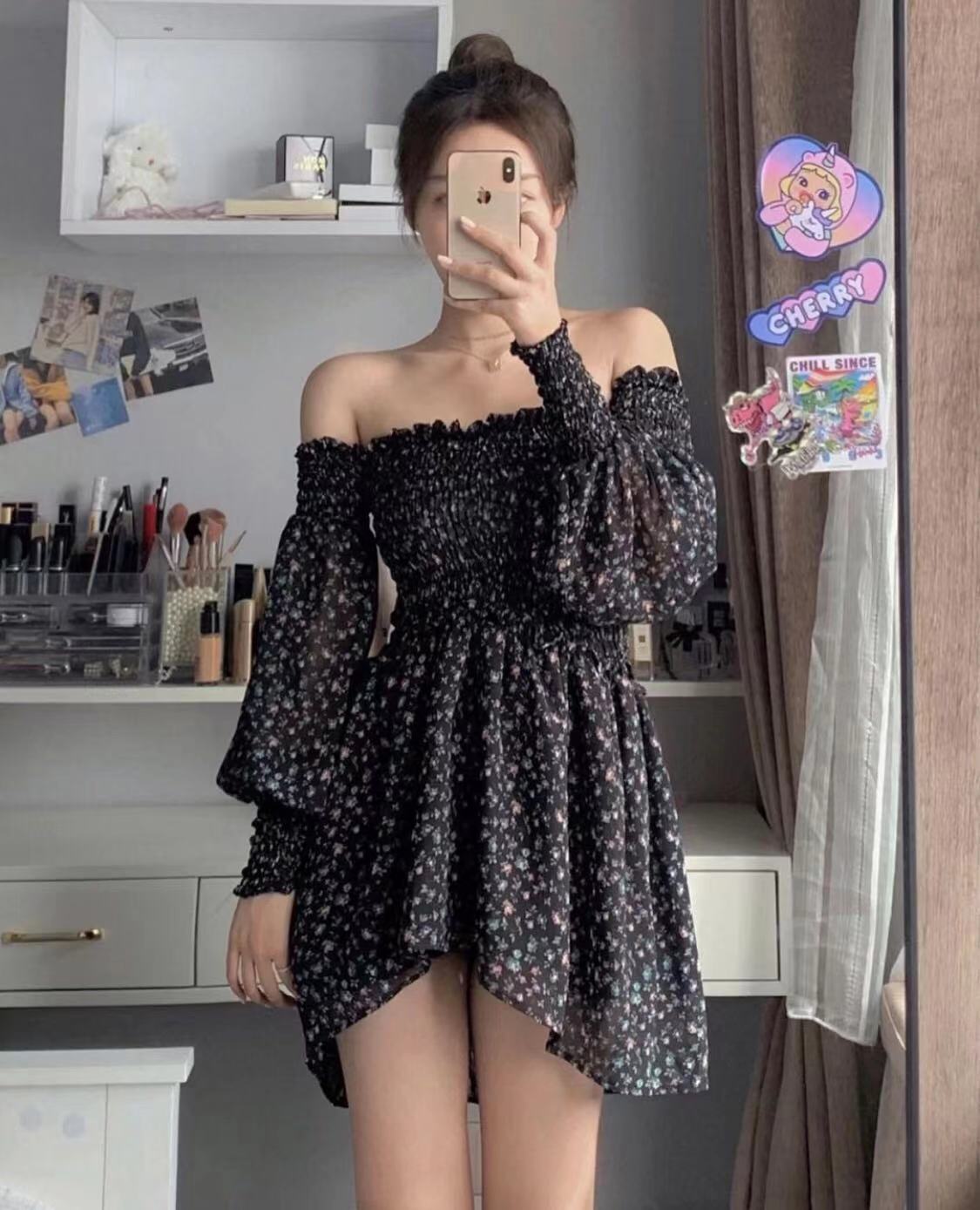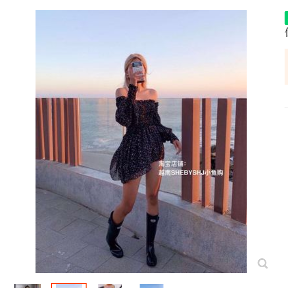 bandarsaya越南代购越韩小鱼夏季黑色碎花一字肩连衣裙度假短裙