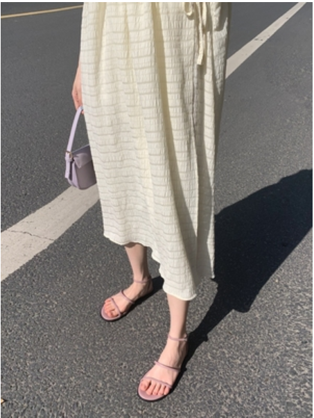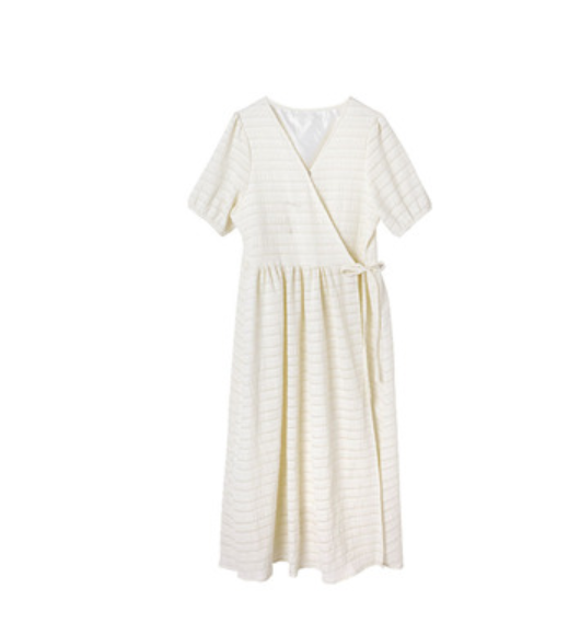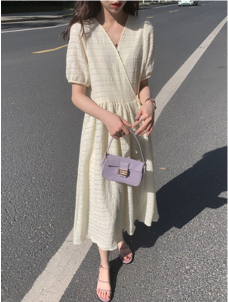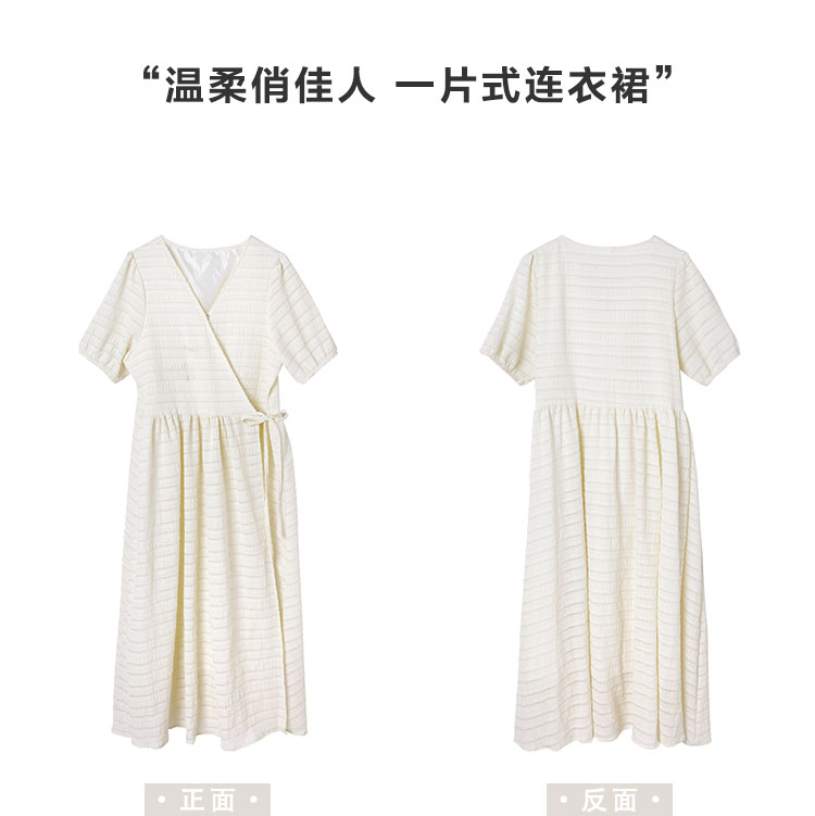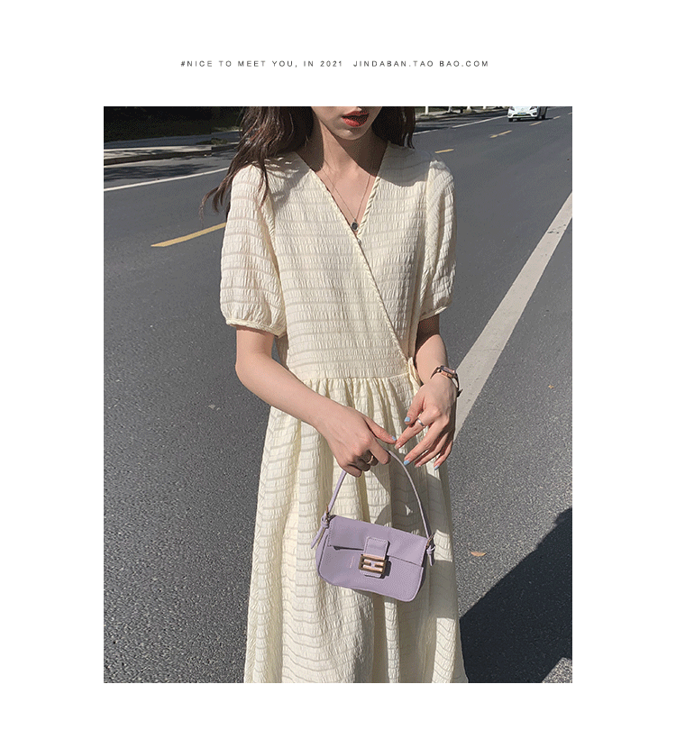 金大班温柔风超仙V领米色茶歇连衣裙子女中长2021春夏季新款穿堂