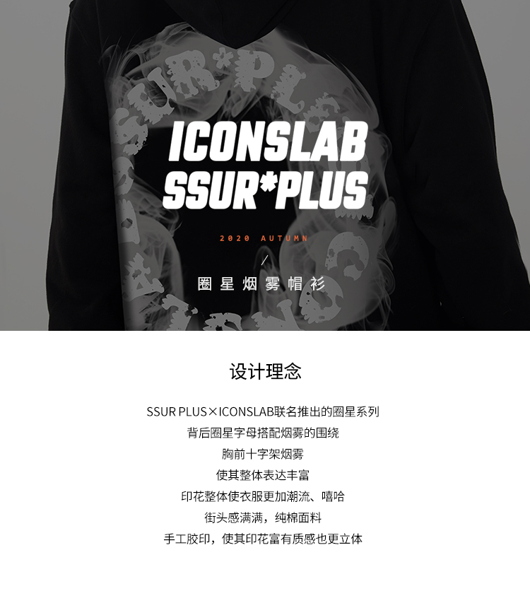 SSURP LUS X ICONSLAB联名款圈星烟雾帽衫男女带帽卫衣街头潮牌