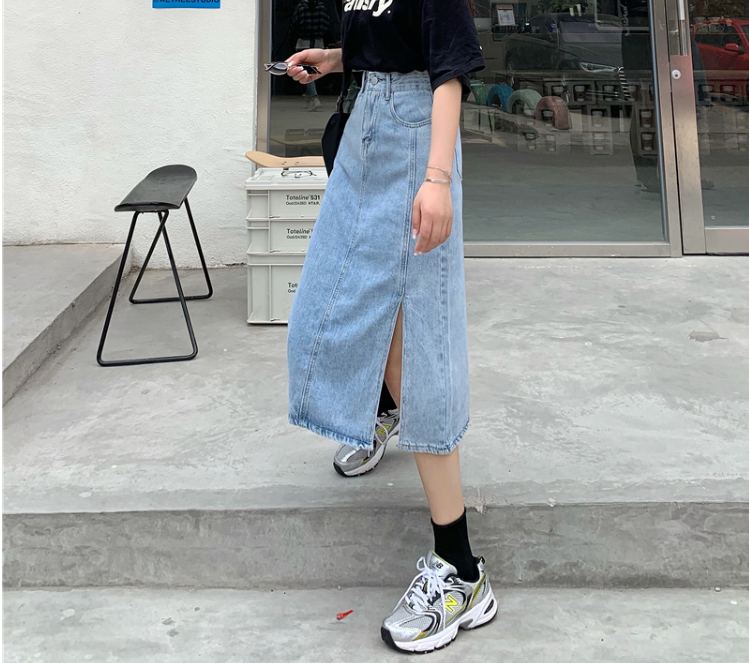中长款牛仔半身裙女春夏季2021新款薄款高腰开叉包臀长裙A字裙子