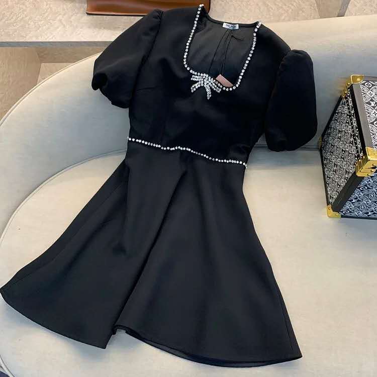 M*IU21春夏新品U领水钻蝴蝶结泡泡袖连衣裙