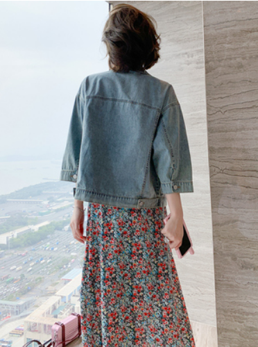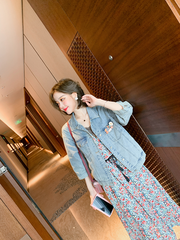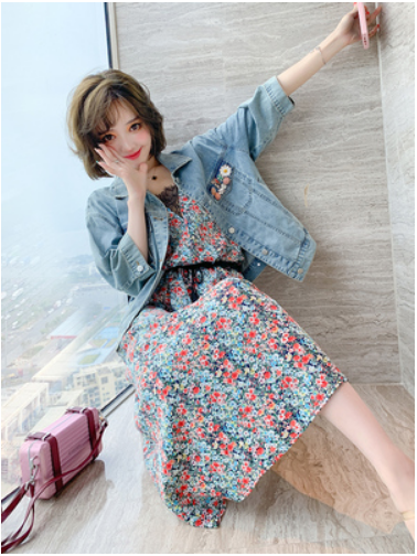 MIUCO钉珠翻领牛仔外套+收腰显瘦碎花连衣裙两件套女2021春夏新款