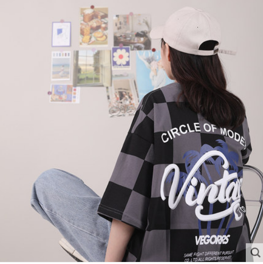 设计感小众格子短袖t恤女ins潮女装夏季女装情侣潮牌甜酷半袖上衣