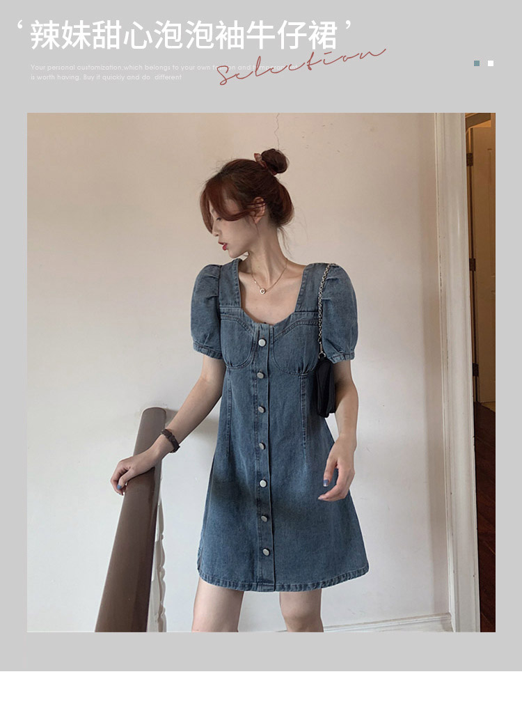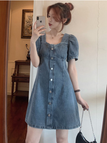 牛仔连衣裙女夏法式小众气质收腰小个子泡泡袖长短款裙子大码短袖