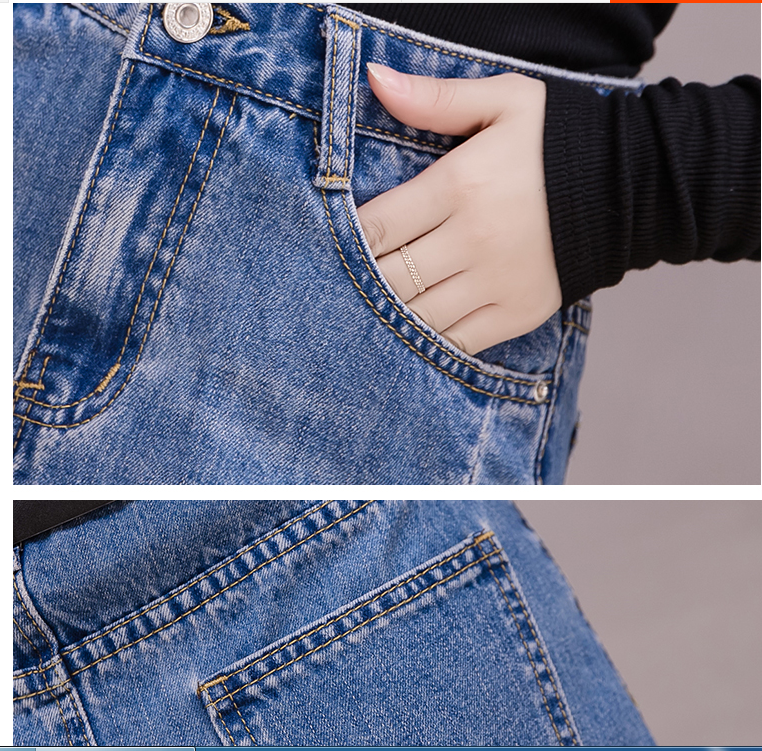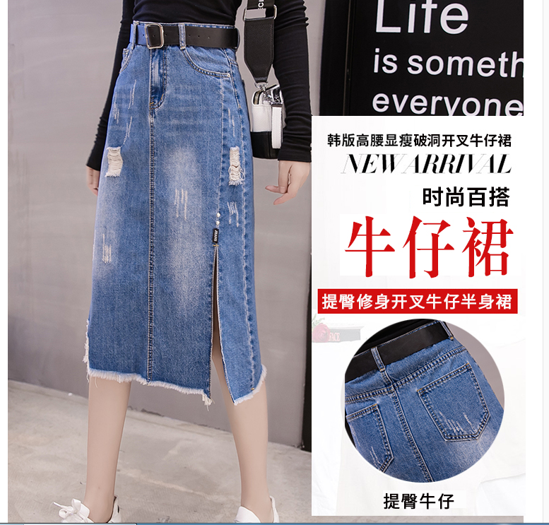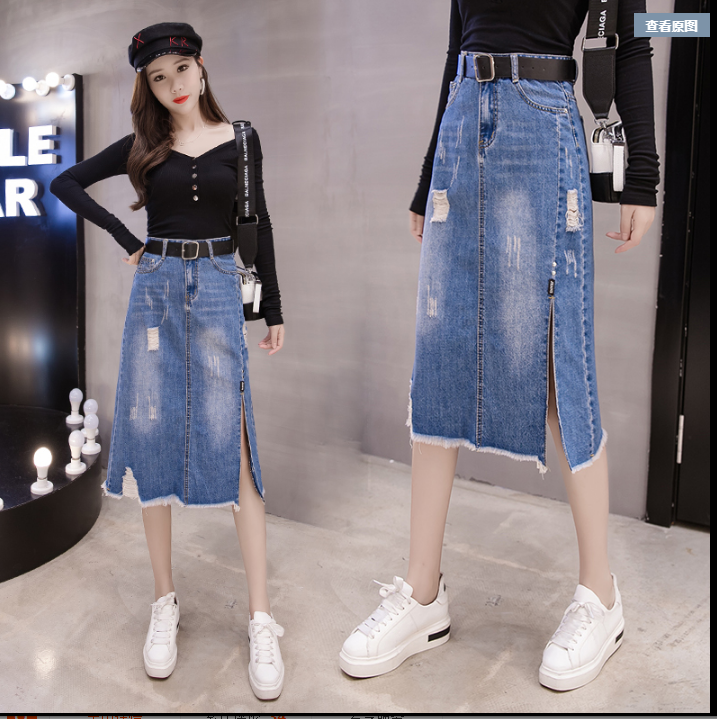 开叉牛仔半身裙女2021年春季新款蓝色中长款a字高腰一步包臀裙子