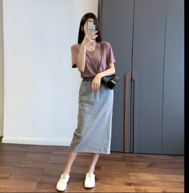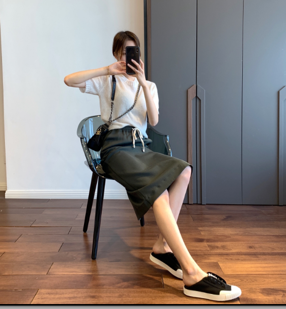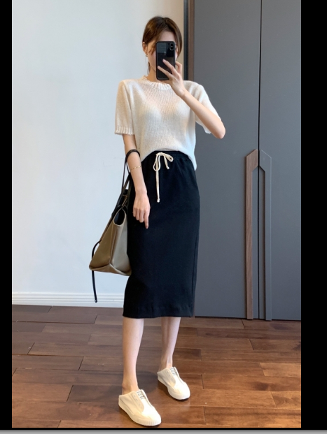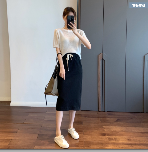 THEWOW客供双面针织棉挺括有型后开衩小心机撞色腰头中长半裙卫裙
