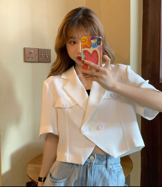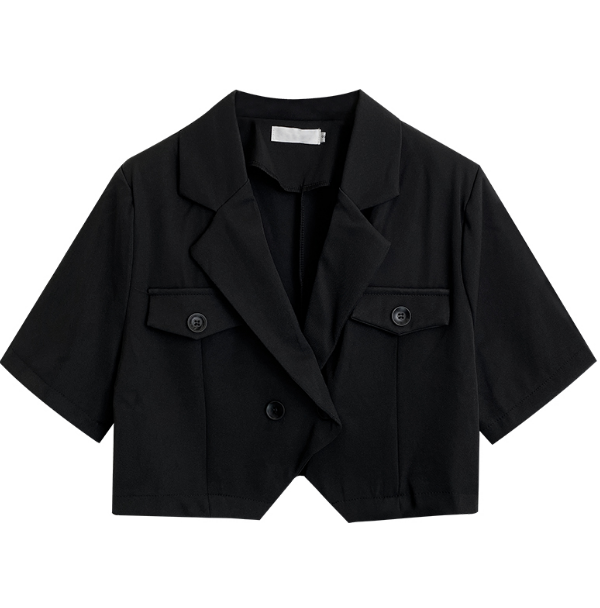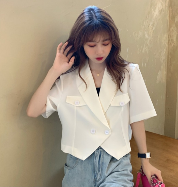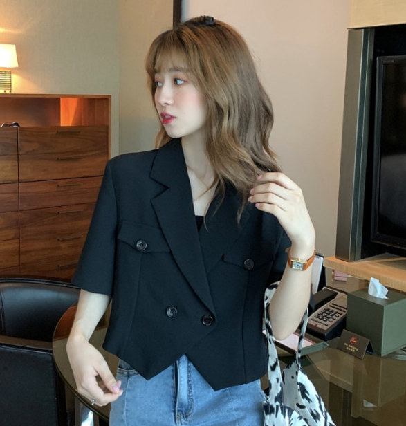 春秋款韩版设计感短款小西装外套女2021新款宽松显瘦洋气短袖上衣