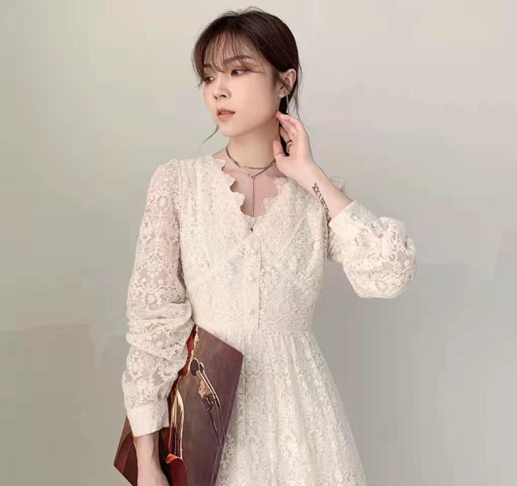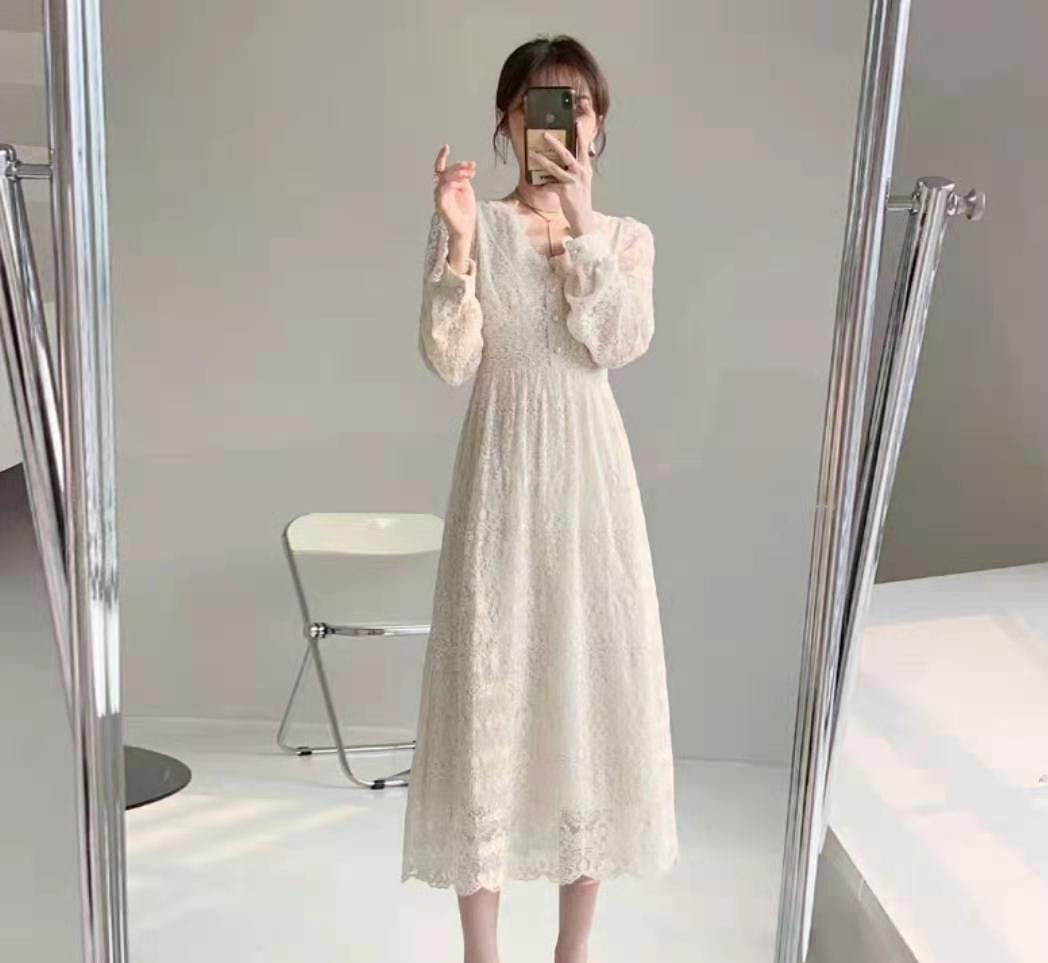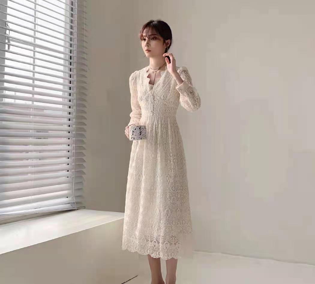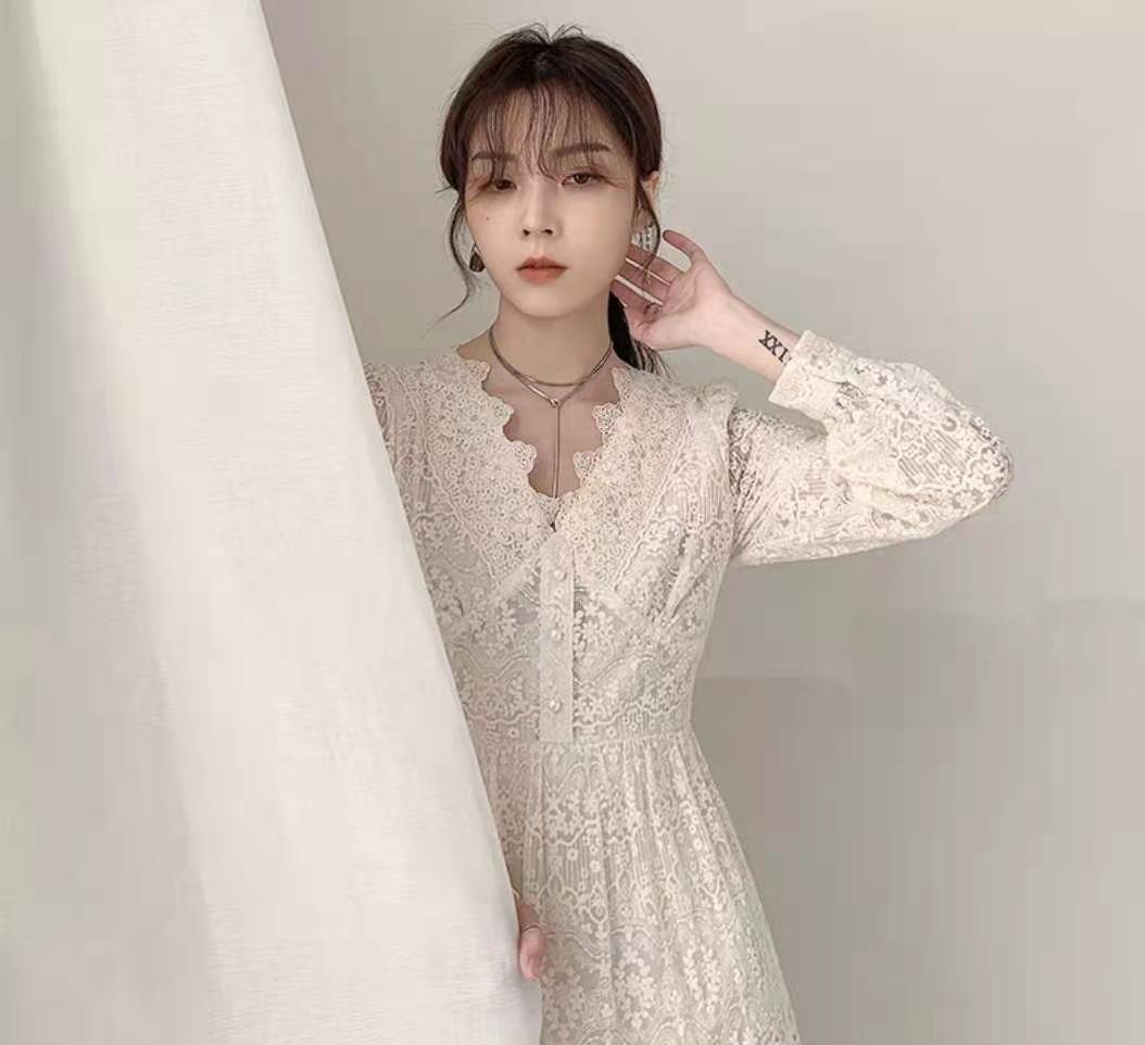 温柔风气质收腰蕾丝连衣裙女春装2021年新款法式名媛超仙v领长裙