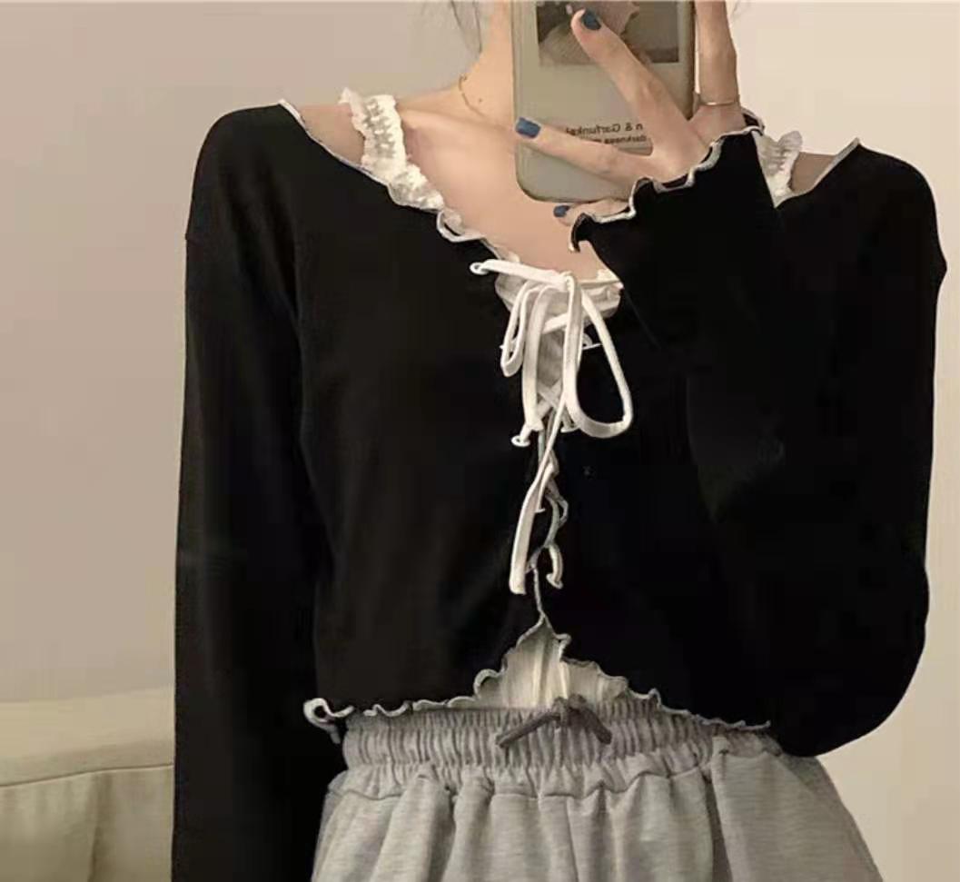 ins超火波浪边系带小开衫上衣女韩版秋季修身心机露脐短款长袖T恤