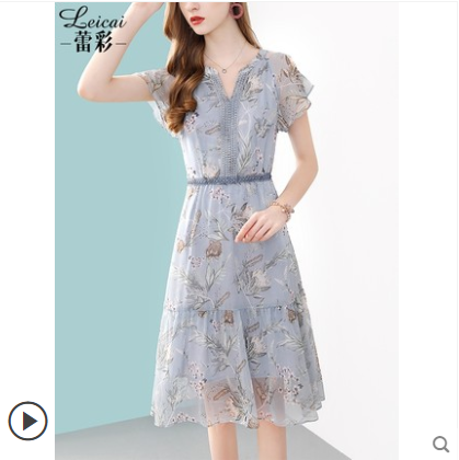 蕾彩灰色v领印花雪纺连衣裙女2021新款夏季短袖中长款A字裙32605