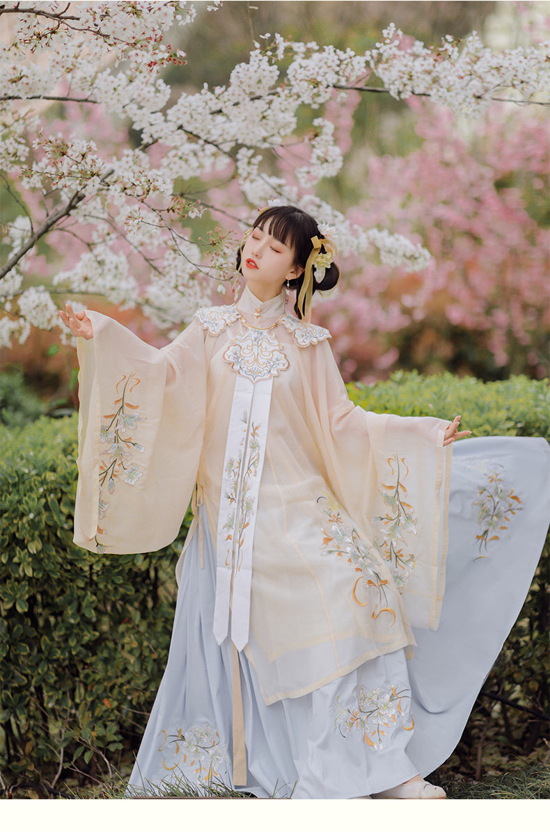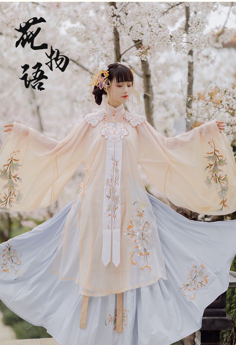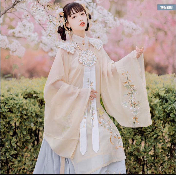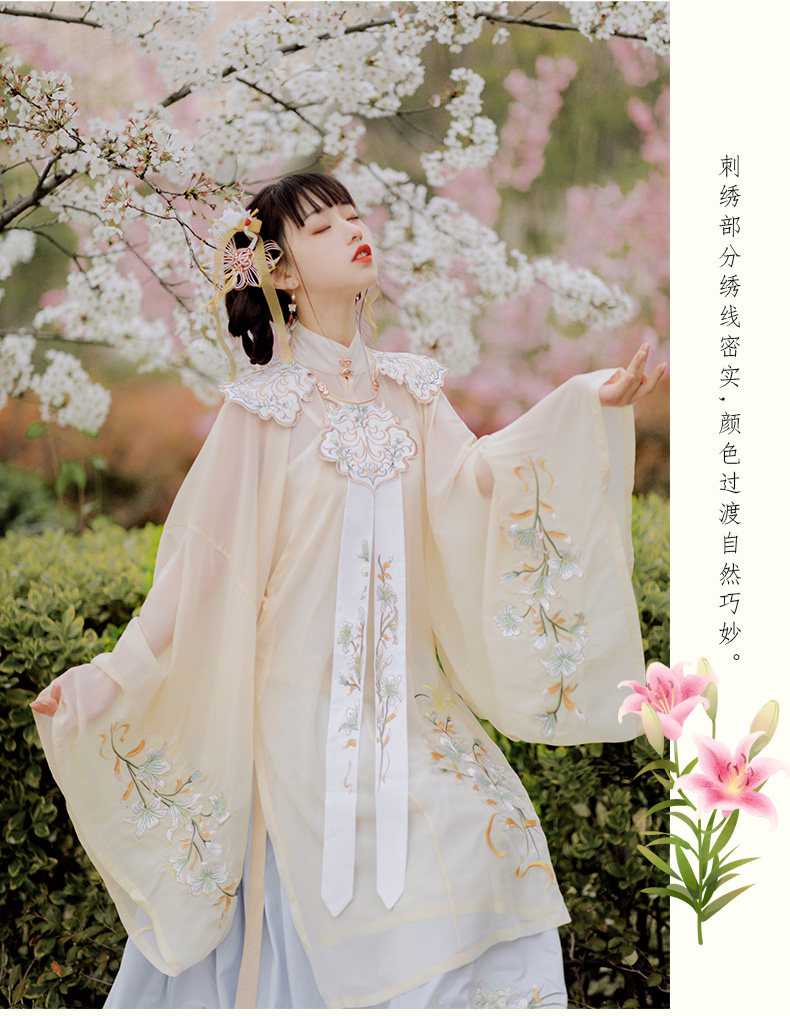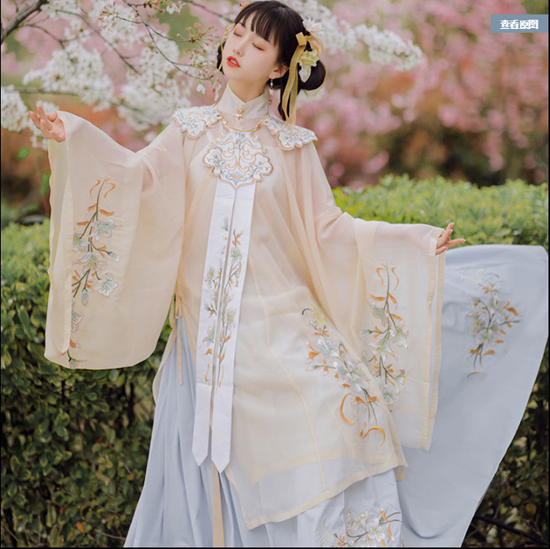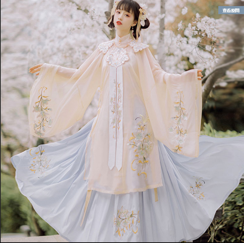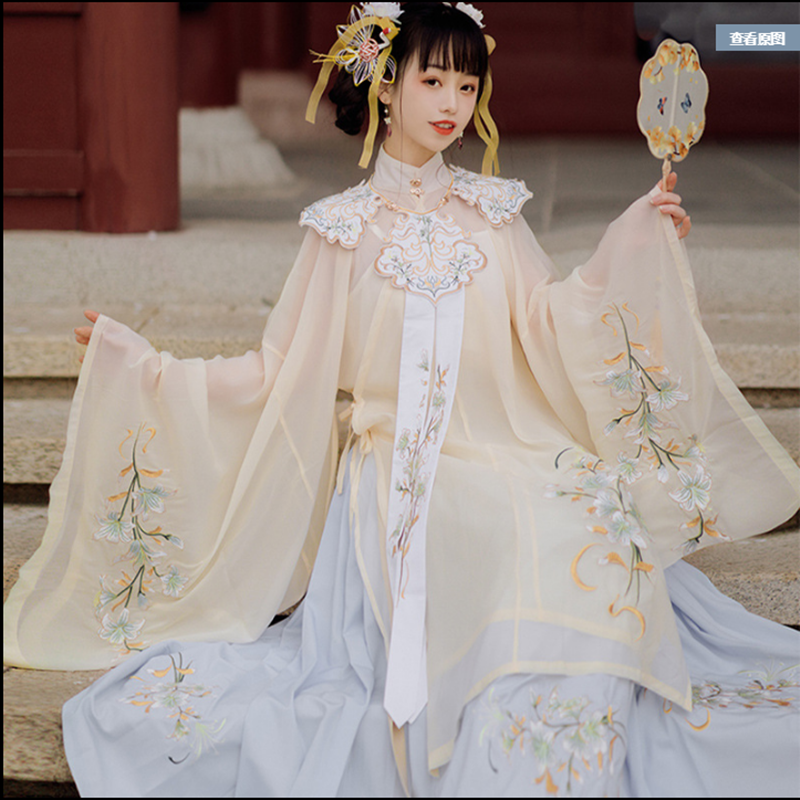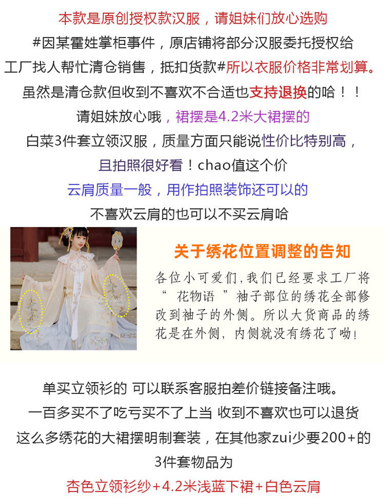颜色分类: 杏色立领纱衫+浅蓝色绣花下裙 立领纱衫+绣花下裙+绣花云肩 立领纱衫+绣花下裙+云肩+吊带 立领纱衫+绣花下裙+云肩+中衣 限时晒图奖励10元红包