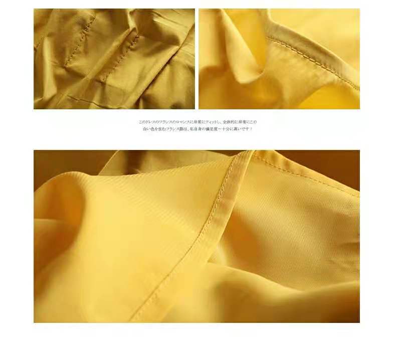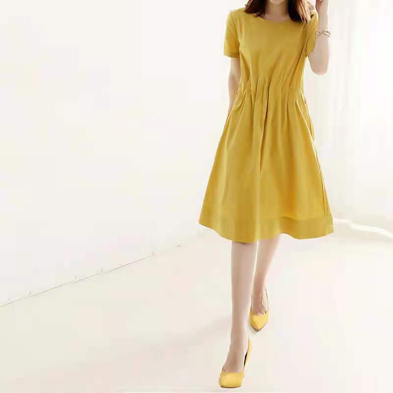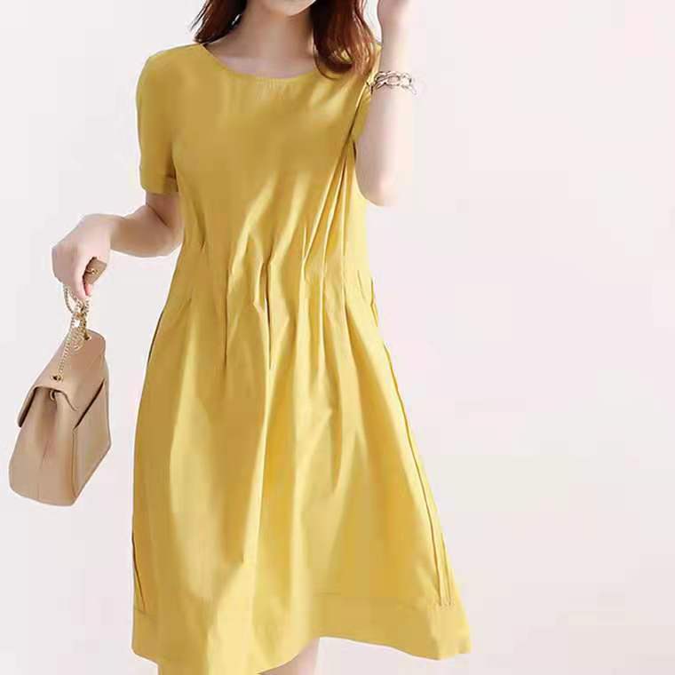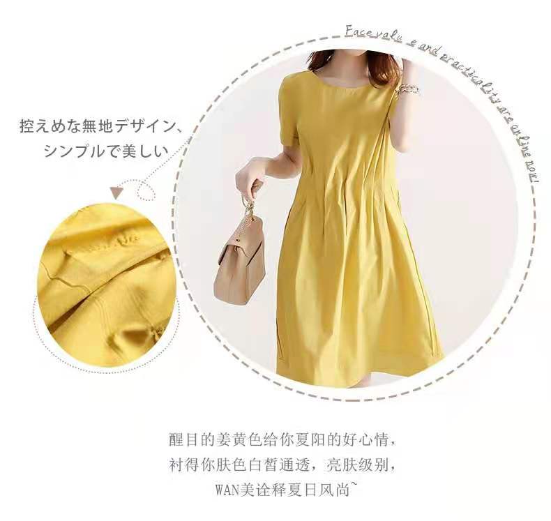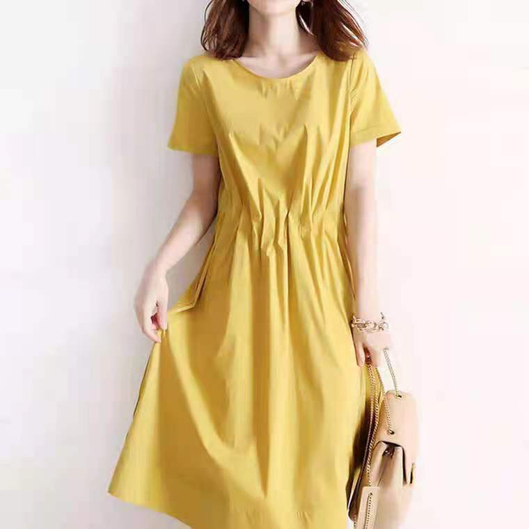 2021夏季新款轻奢圆领短袖连衣裙黄色收腰长裙女