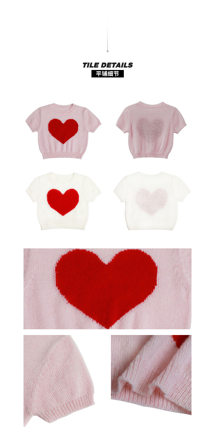 KAKA Studio甜到心尖尖 复古爱心修身短袖针织衫女外穿薄款短上衣夏