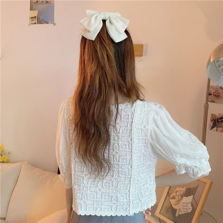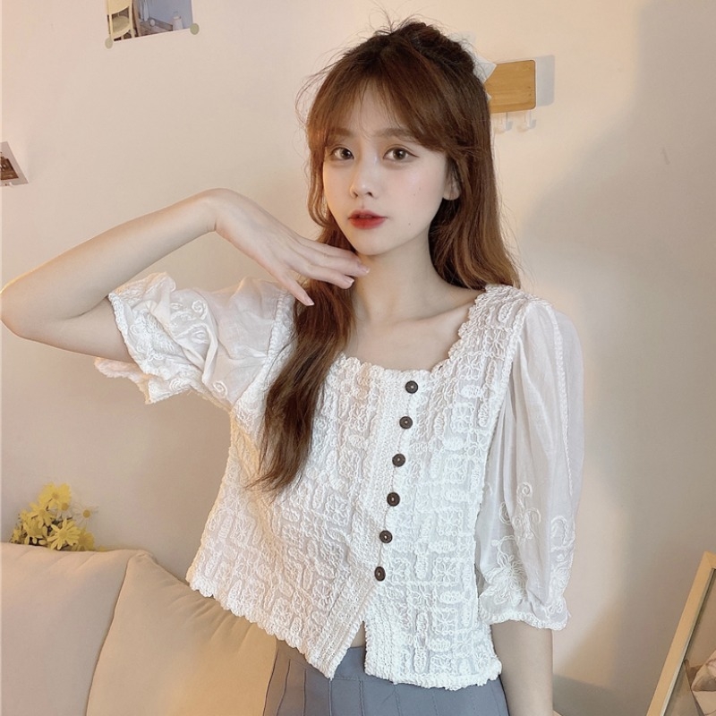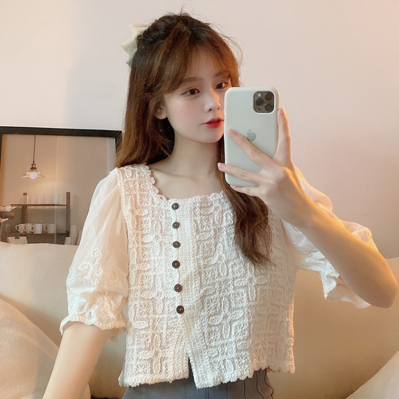 方领短款别致上衣女夏季2021新款设计感法式甜美温柔短袖蕾丝衬衫