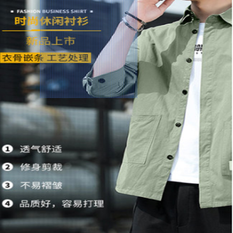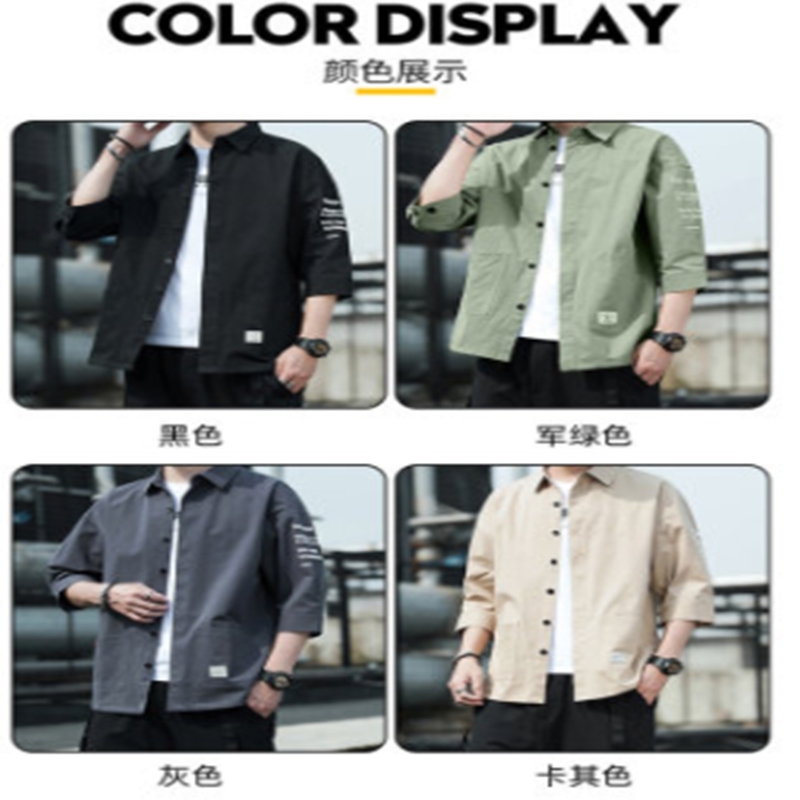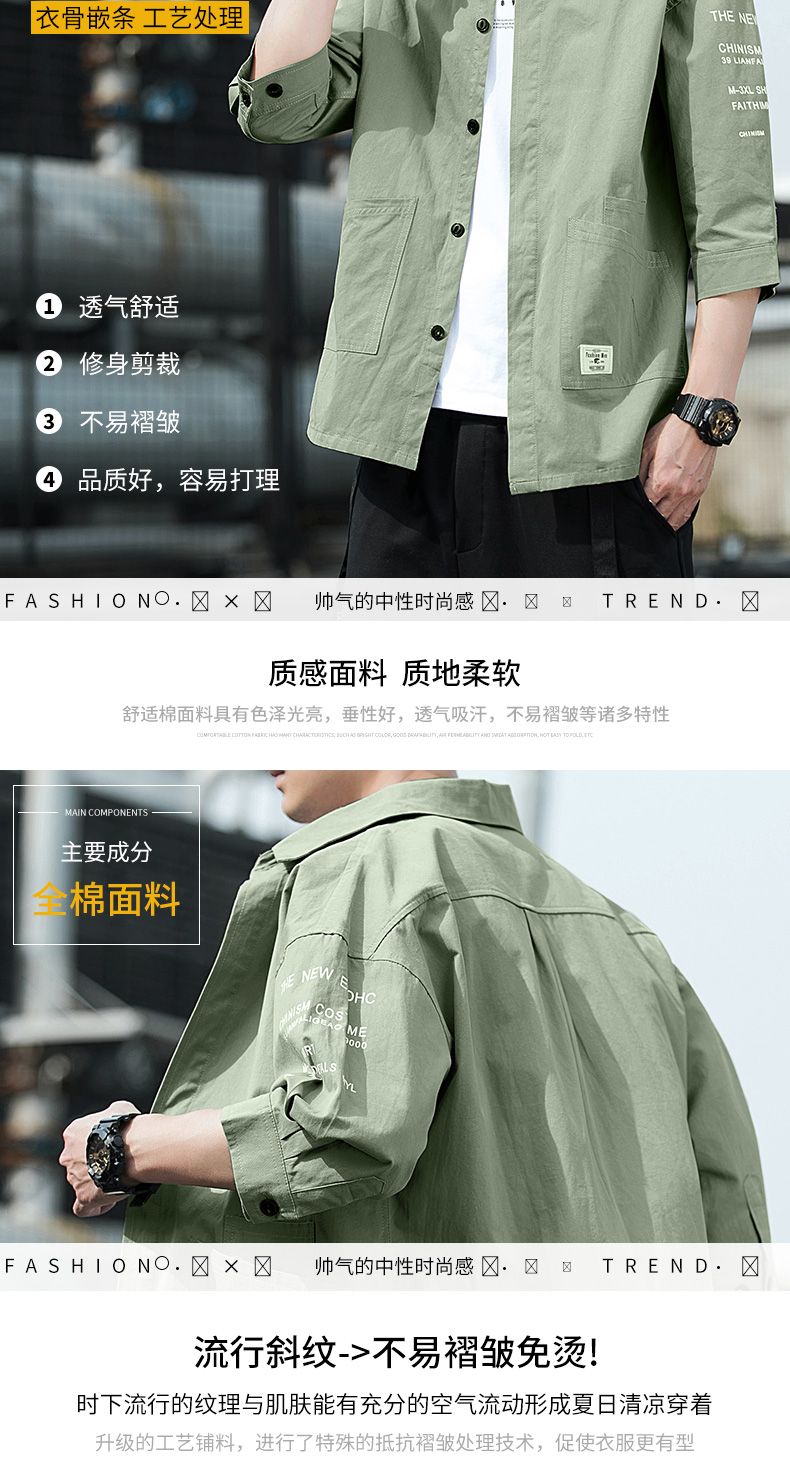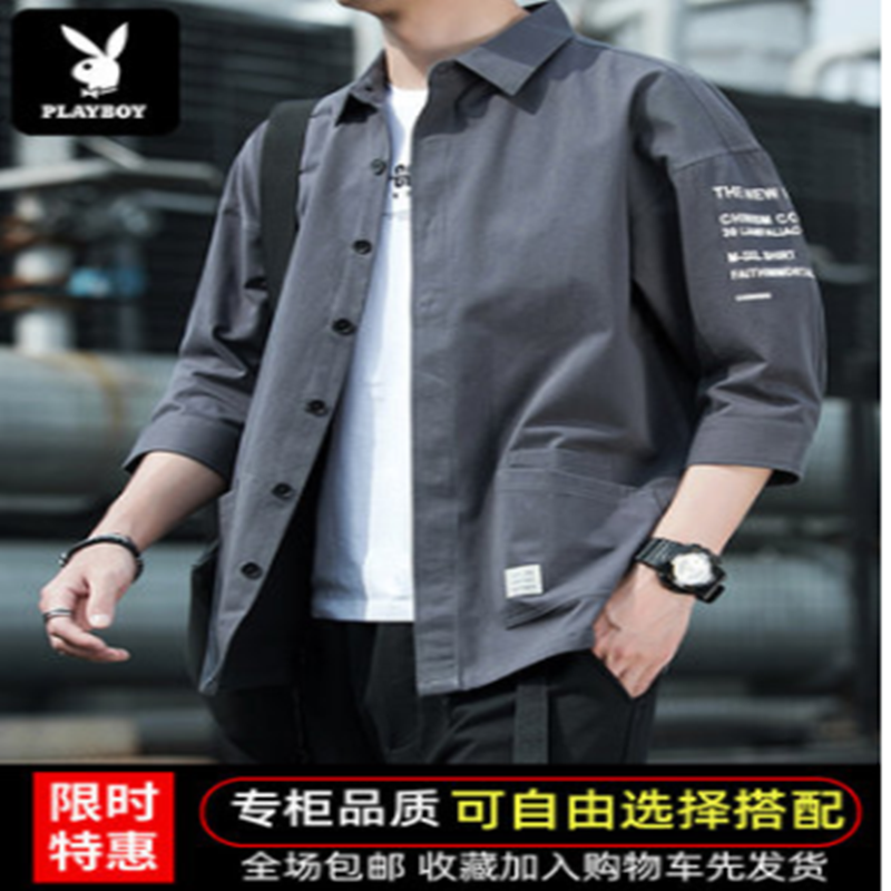 花花公子衬衫男潮流夏季牛仔工装七分短袖春秋外套休闲衬衣痞帅气