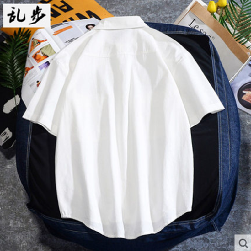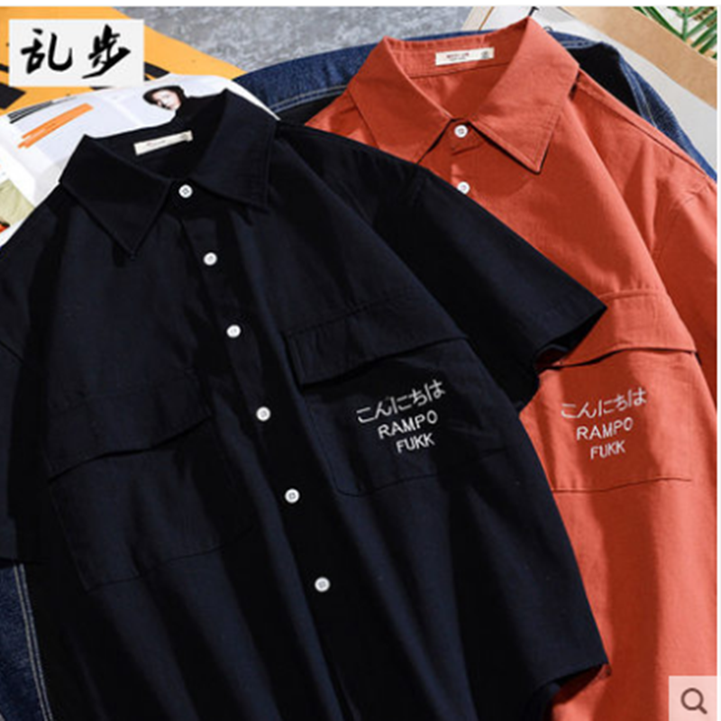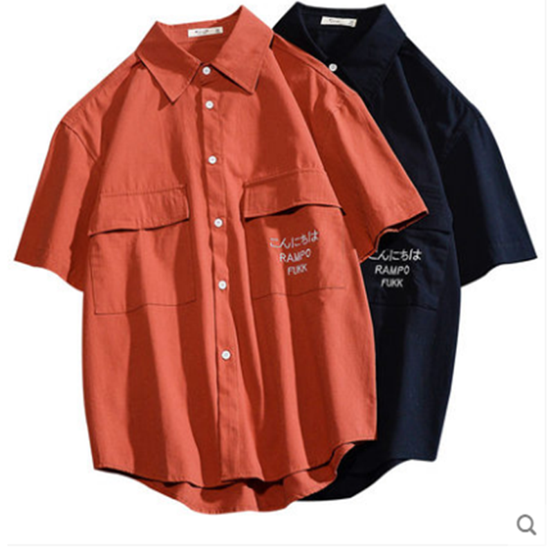 日系工装短袖衬衫男生港风潮牌夏季圆弧下摆宽松半袖衬衣韩版潮流