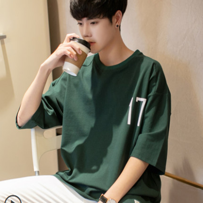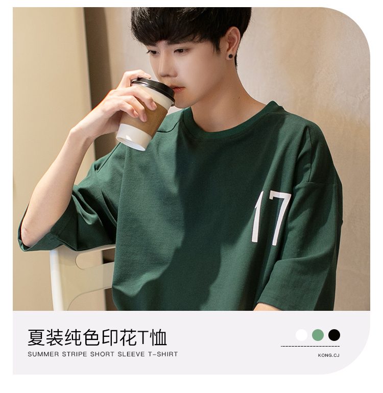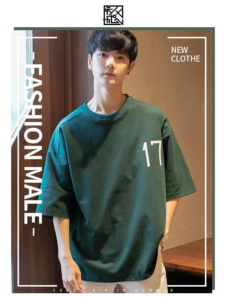 夏装季2021新款潮牌潮流短袖T恤男士宽松七分袖纯棉上衣服青少年