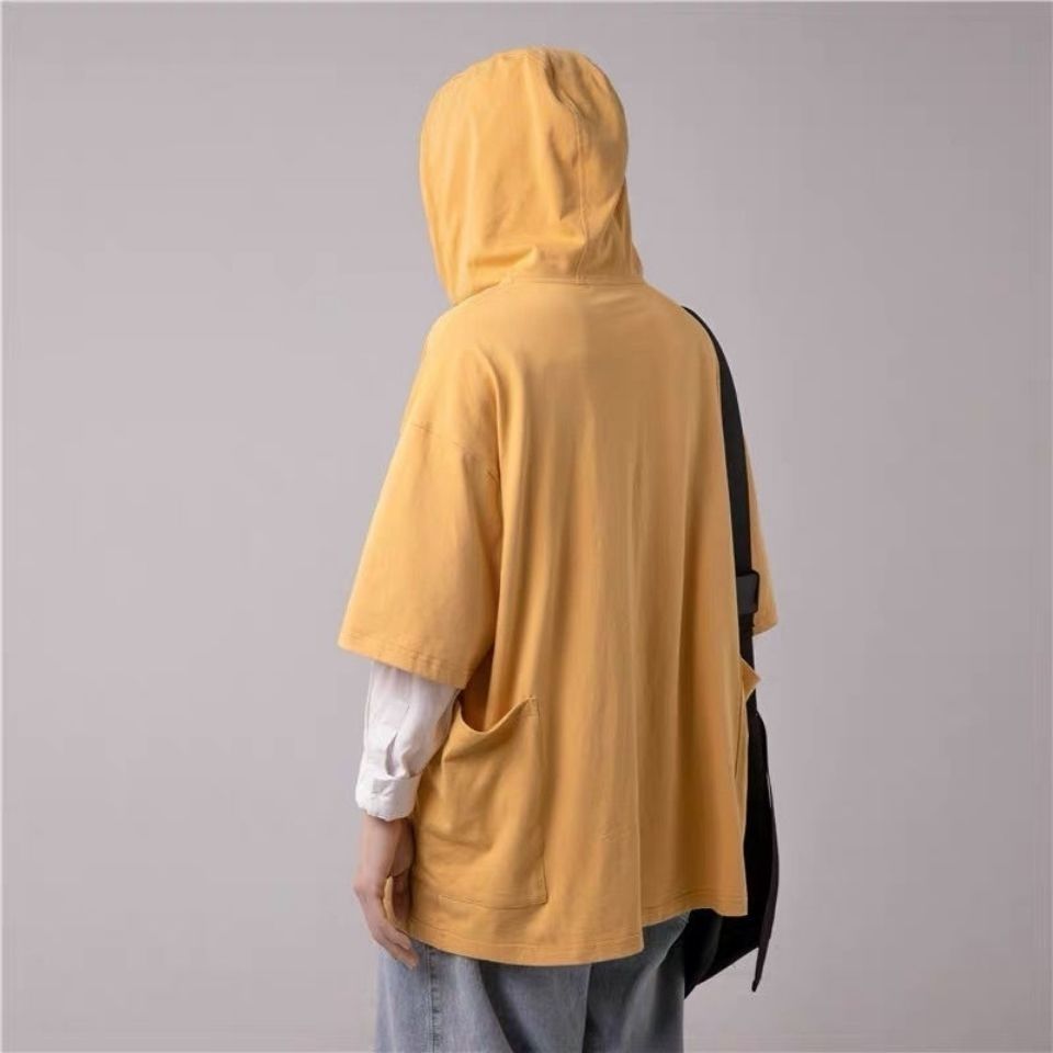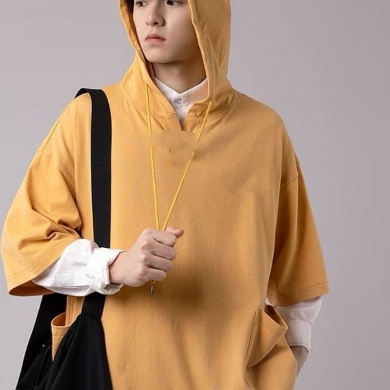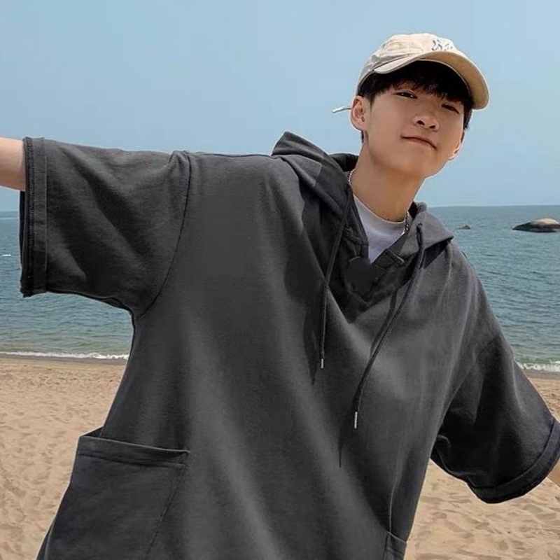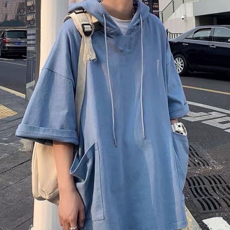 夏季短袖t恤连帽卫衣男韩版宽松港风学生半袖纯色口袋上衣ins潮流