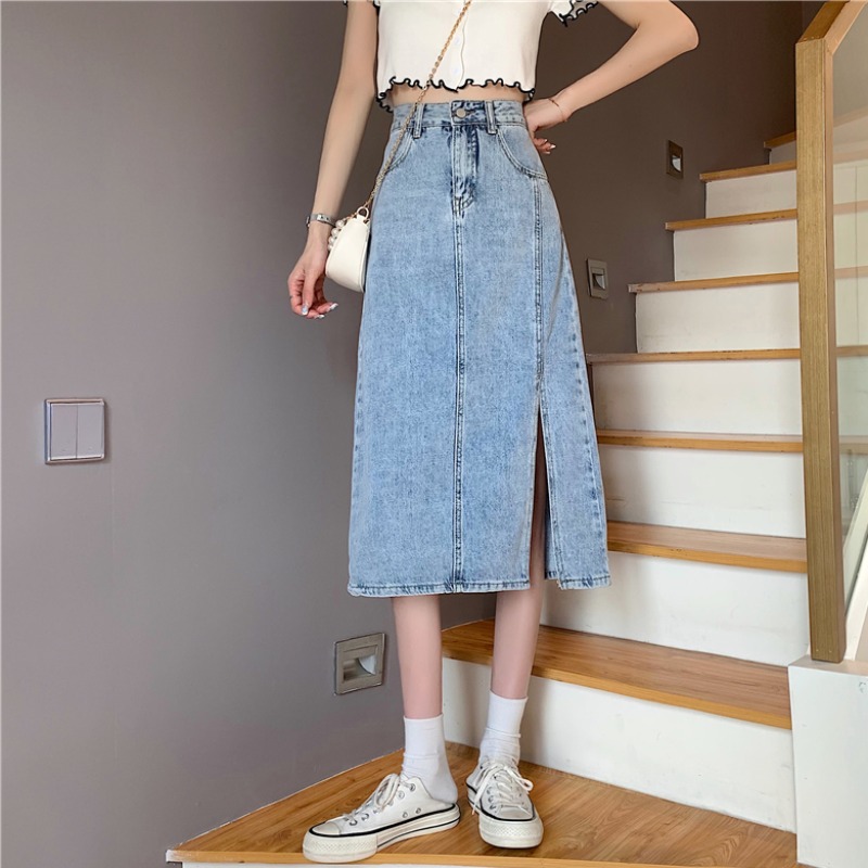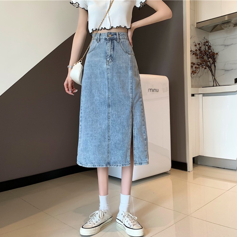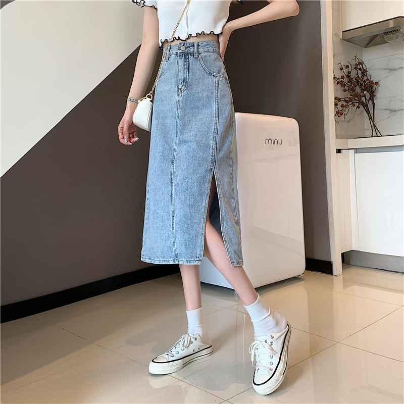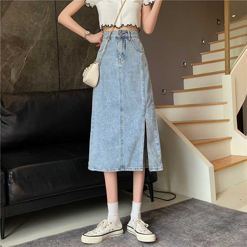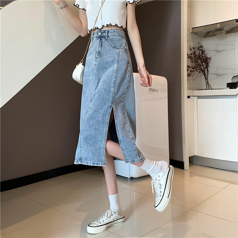 复古半身裙女小个子2021夏季新款ins开叉高腰百搭中长款牛仔裙 黑色