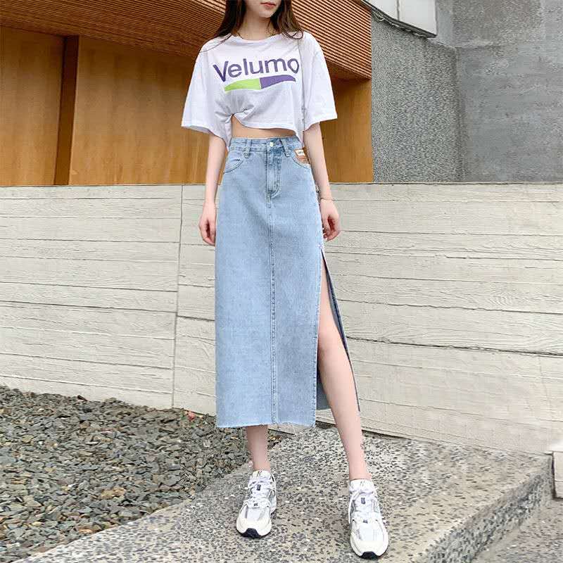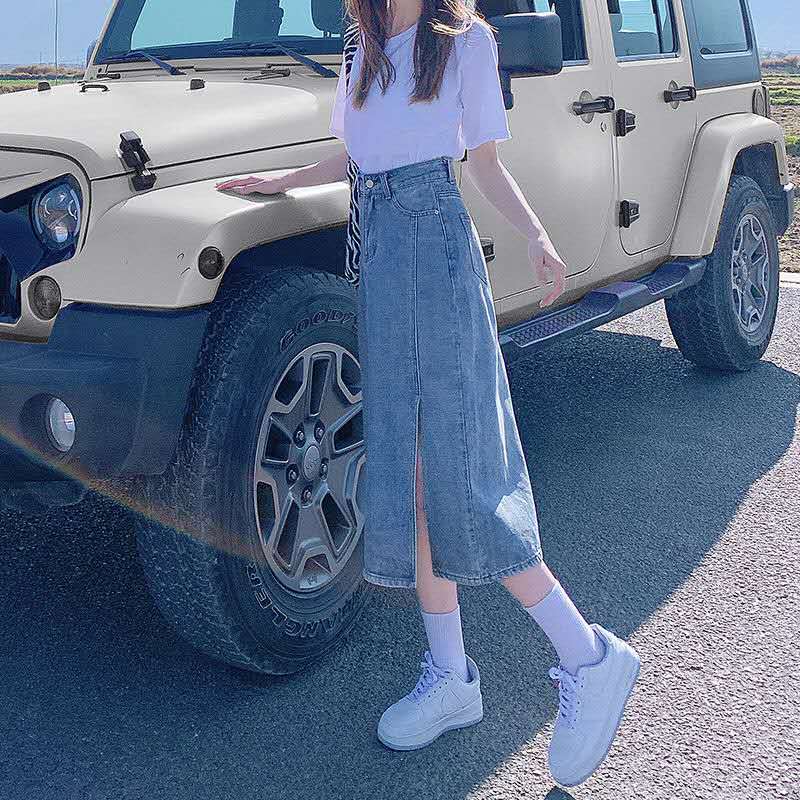 质量好白塔 实惠开叉半身裙女夏季薄款高腰2021新款春装小个子a字中长牛仔裙长裙