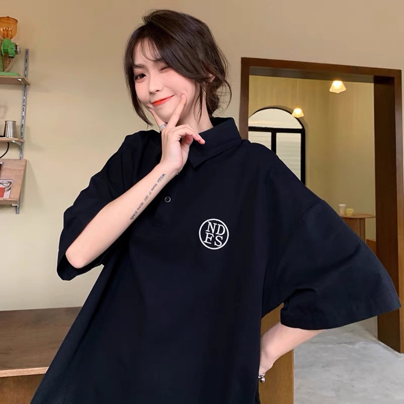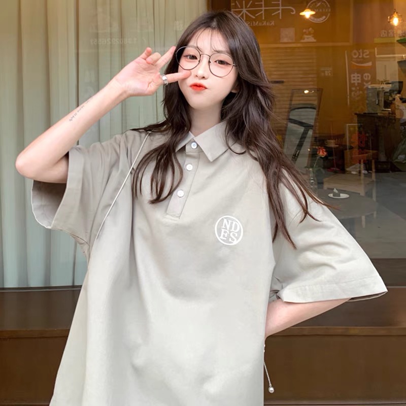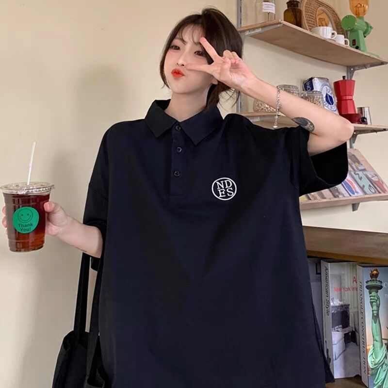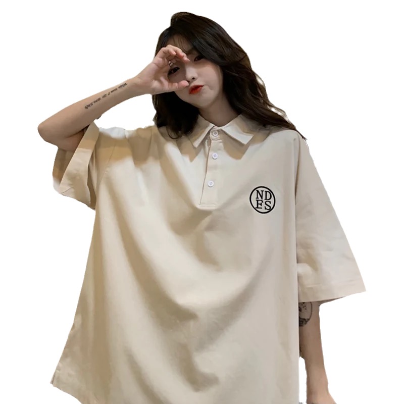 日系polo衫短袖T恤女学生夏装百搭韩版宽松原宿风上衣)面料分类: 珠地布图案: 图案面料材质: 涤棉款式细节: logo图案工艺处理: 水洗消费