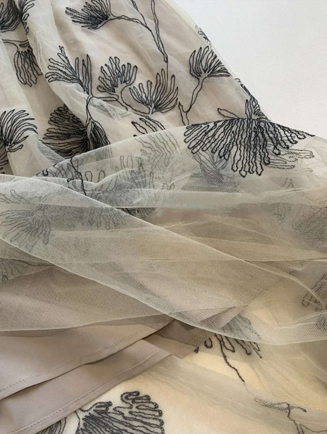 外双层是进口机做的立体网眼绣花,单层纱去看刺绣,都是立体勾线。