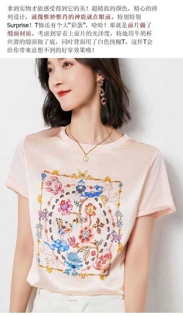【高端缎面桑蚕丝手感短袖t】日系宽松显瘦上衣 ,优雅法式印花尽显气质!