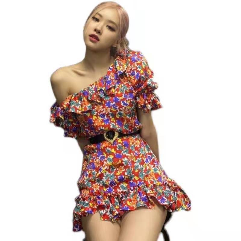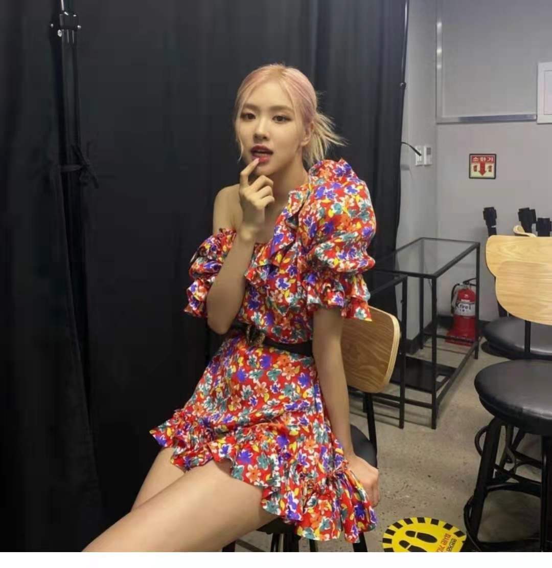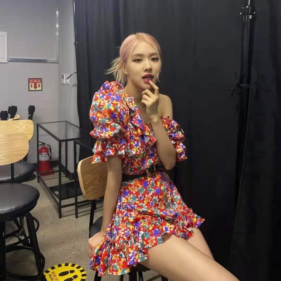 blackpink朴彩英rose同款雪纺法式泡泡袖碎花性感甜美连衣裙女夏