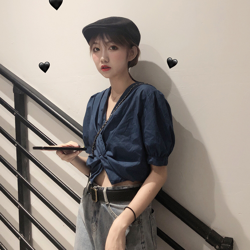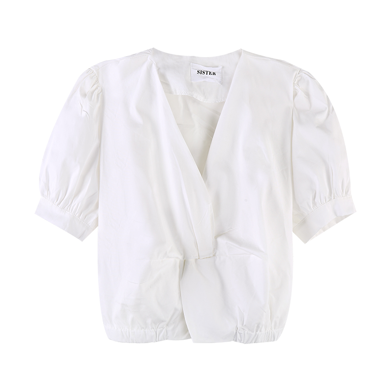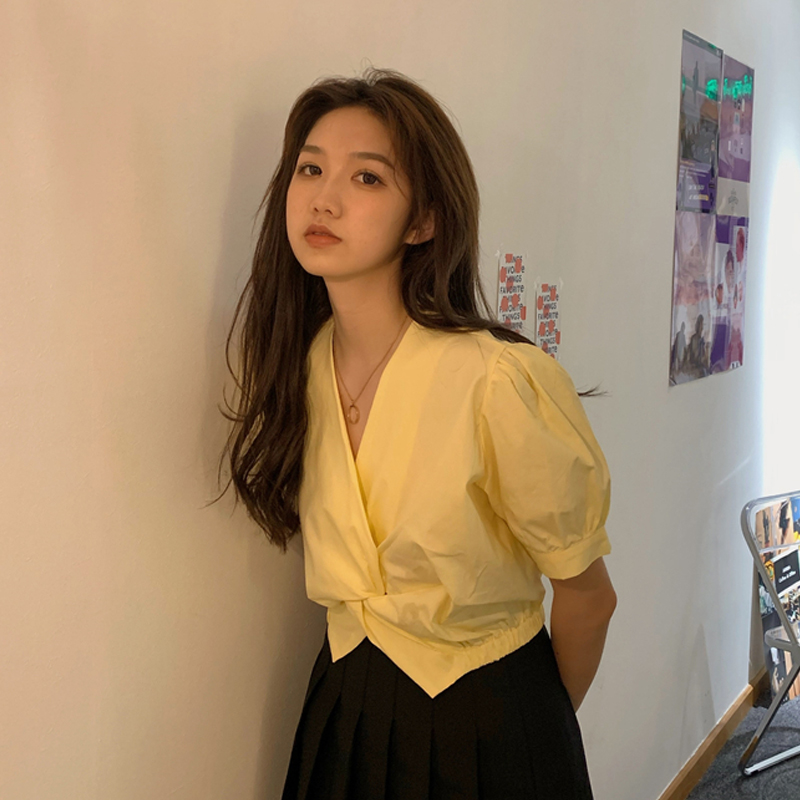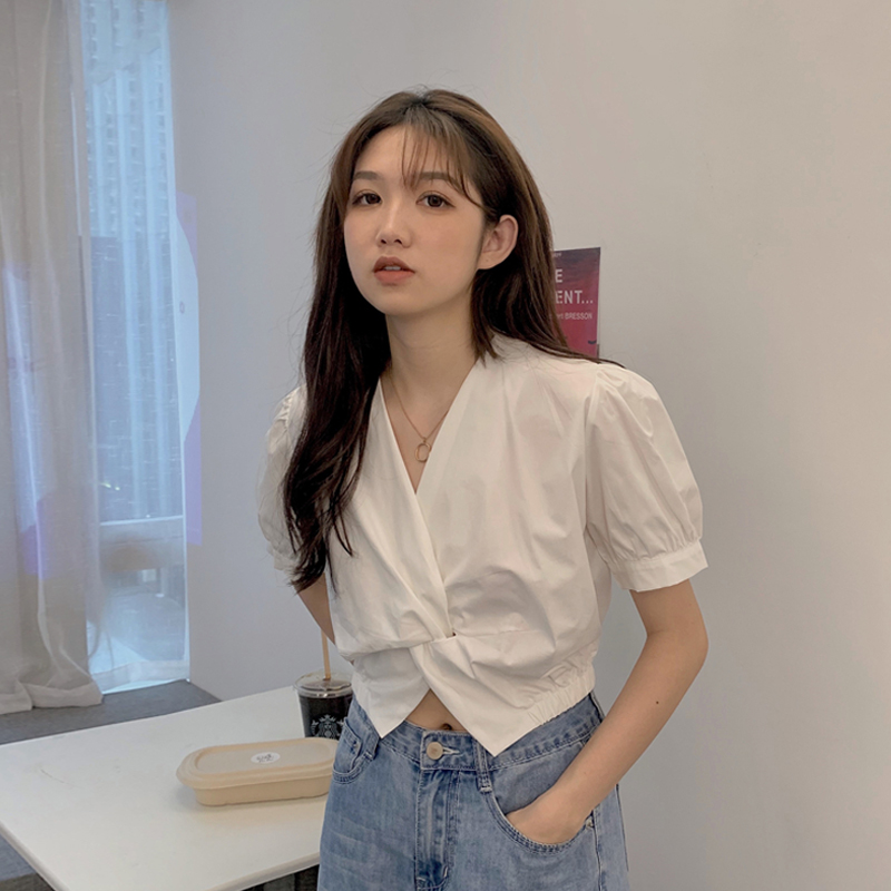 正品质量好,白搭,实惠辣妹白色短袖衬衫女设计感小众2021新款夏季法式高腰V领短款上衣