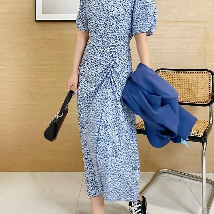 【设计师品牌】2021新款夏碎花连衣裙收腰显瘦气质法式复古V领泡泡袖收腰中长碎花裙女装