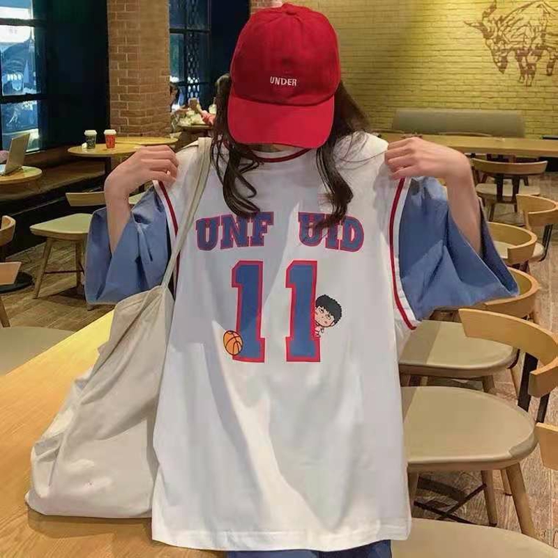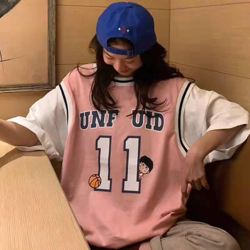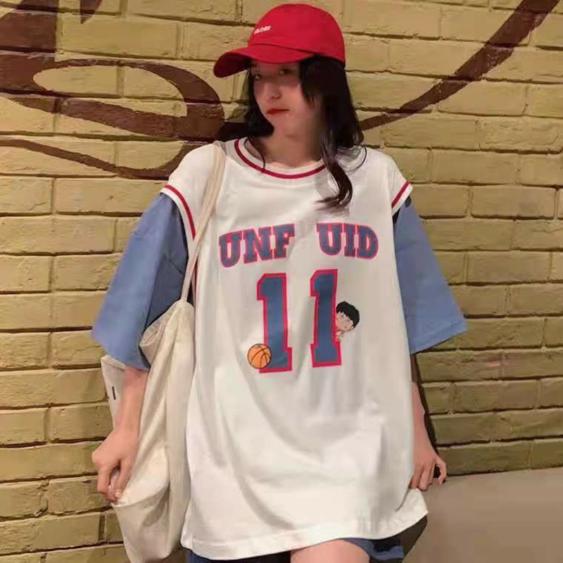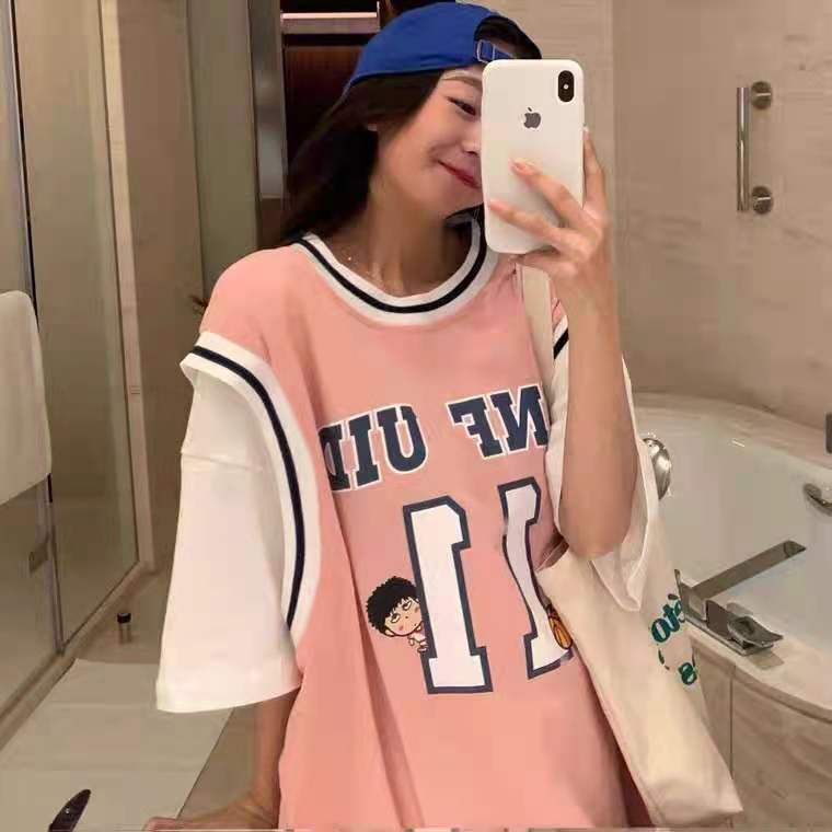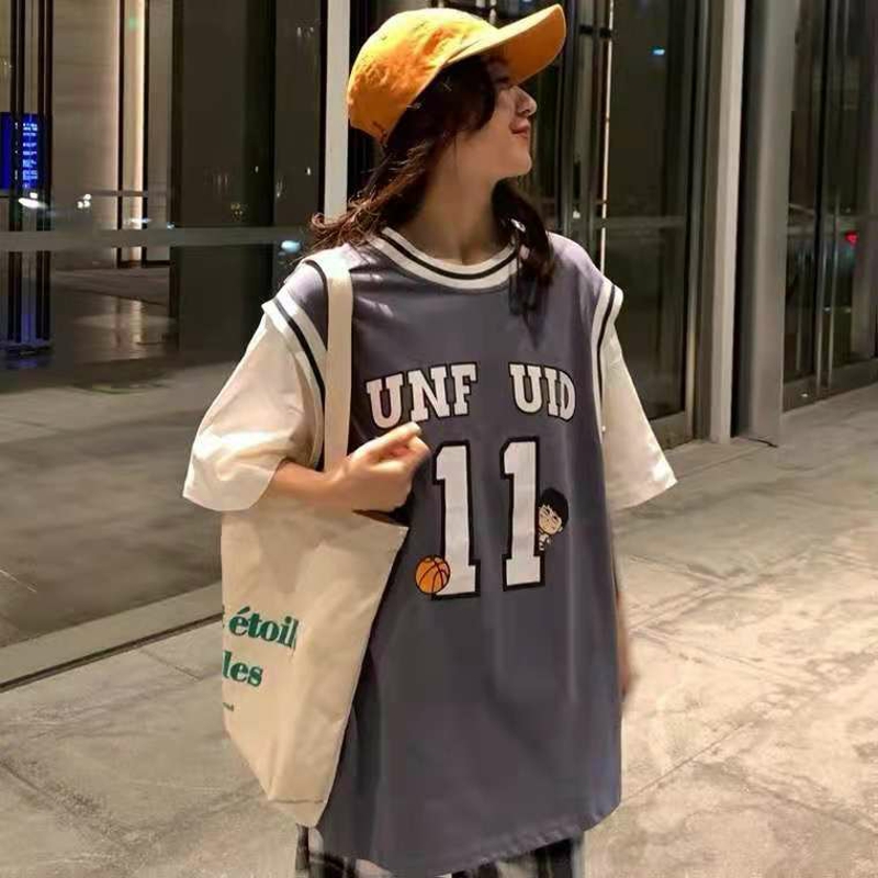 假两件短袖t恤女宽松韩版潮ins港风学生原宿风半袖超火篮球服上衣