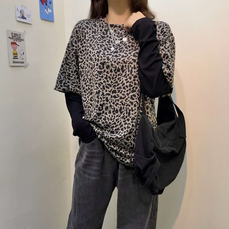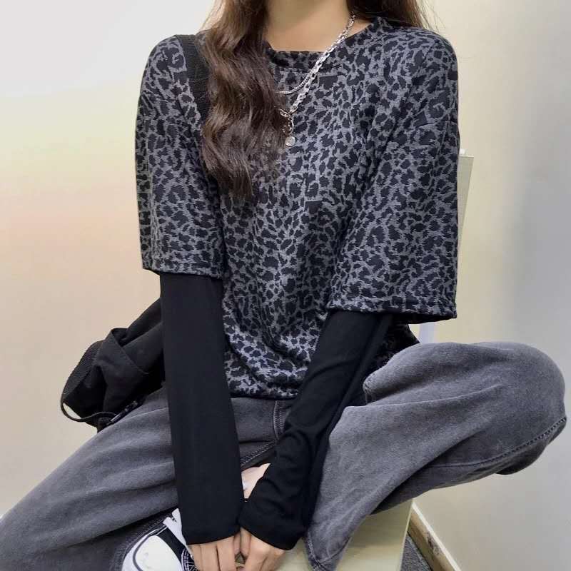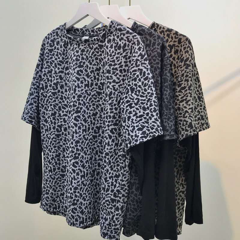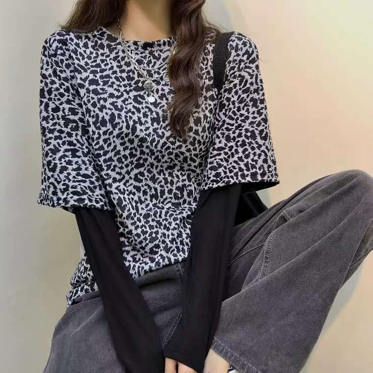 夏季2021年新款百搭打底衫豹纹假两件上衣洋气宽松长袖内搭T恤女