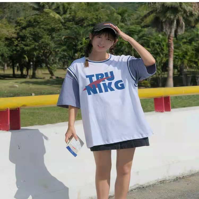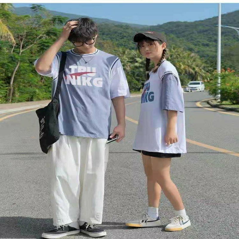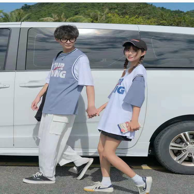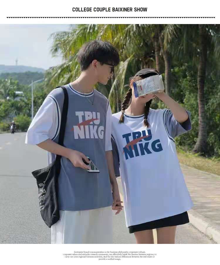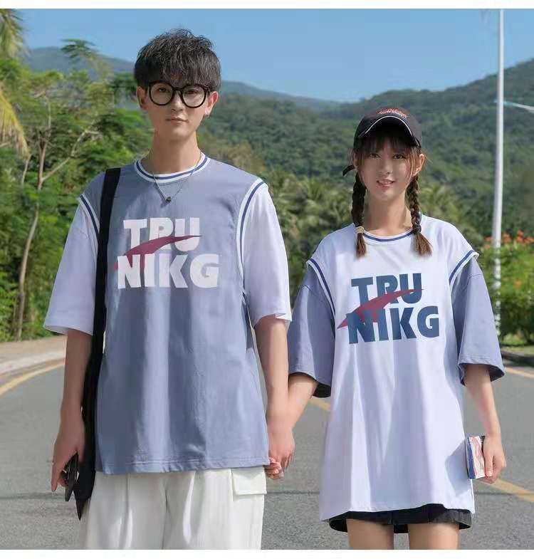 情侣装学院风2021夏季新款假两件圆领短袖T恤字母印花上衣百搭潮
