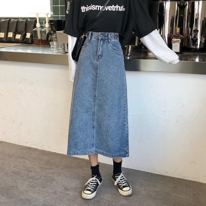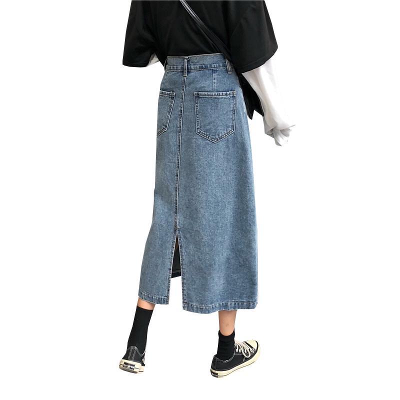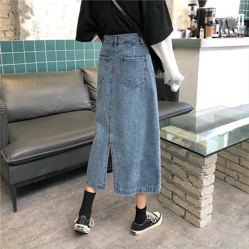 春季韩版ins复古百搭开叉牛仔半身裙女中长款高腰a字显瘦包臀裙潮 蓝色