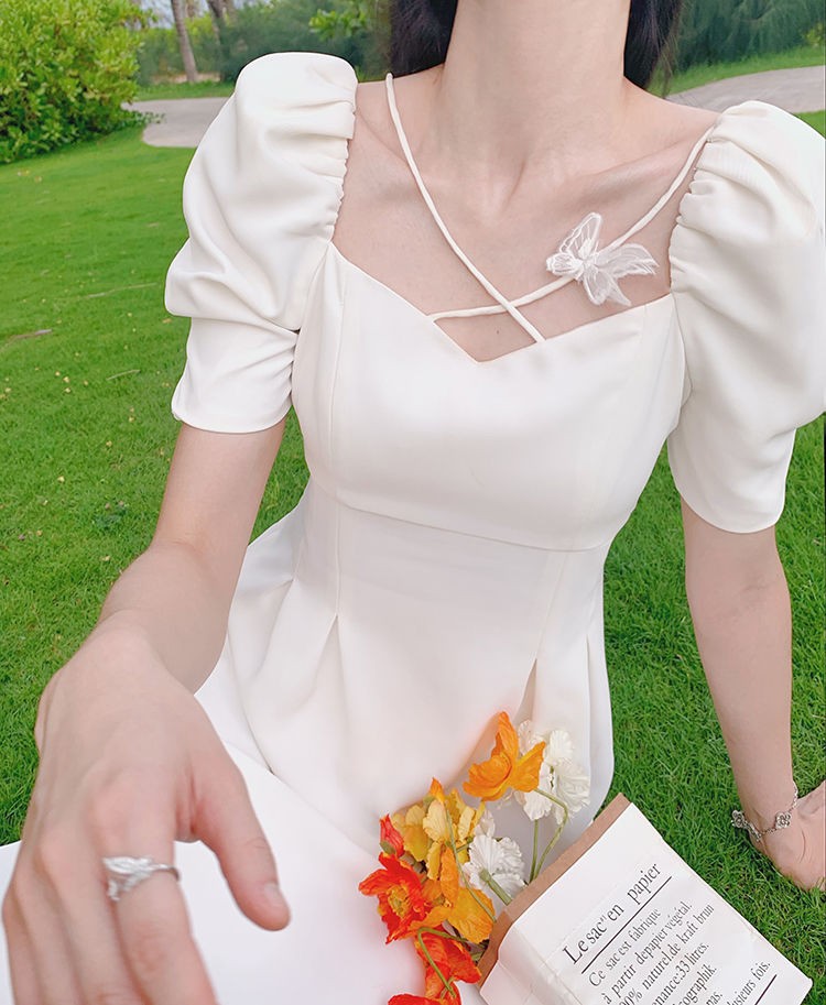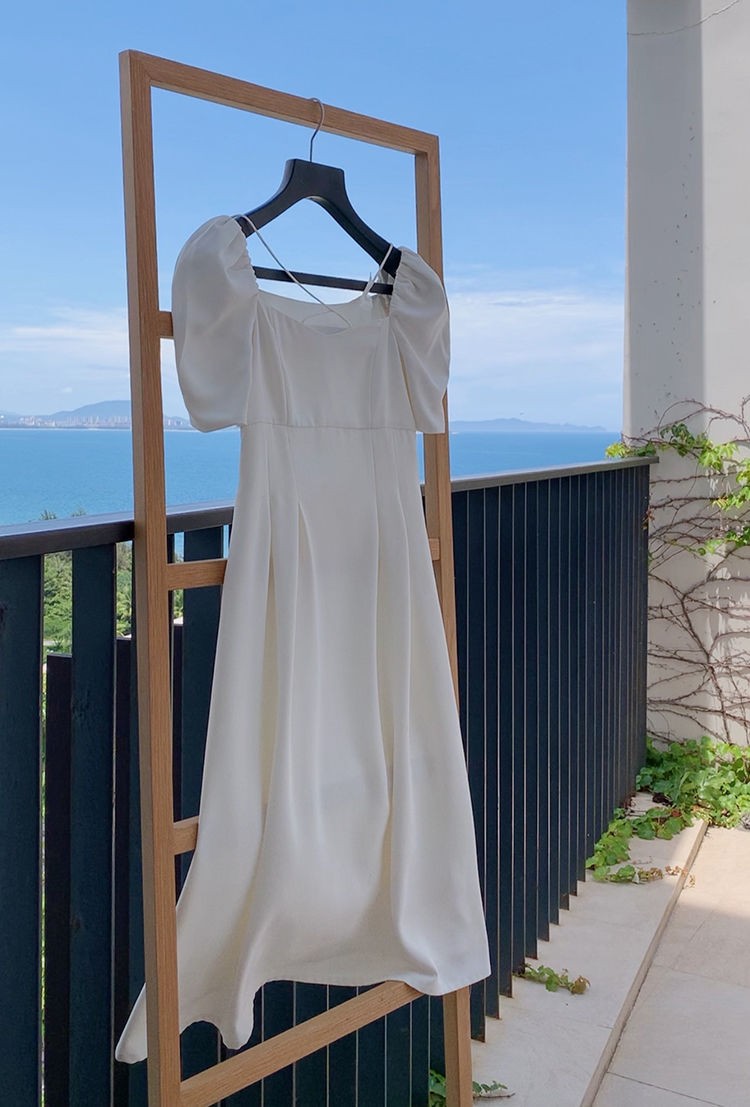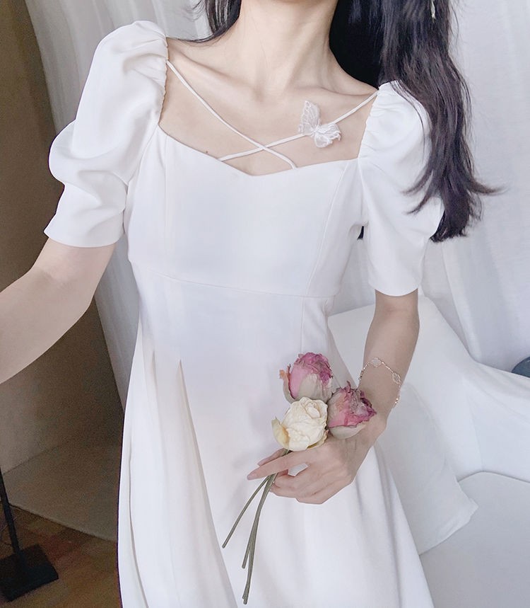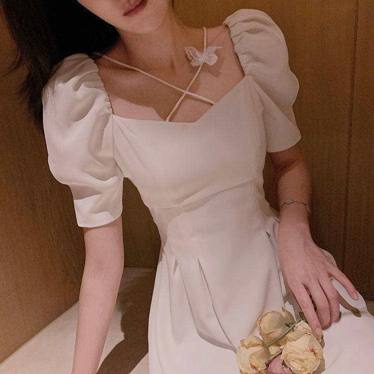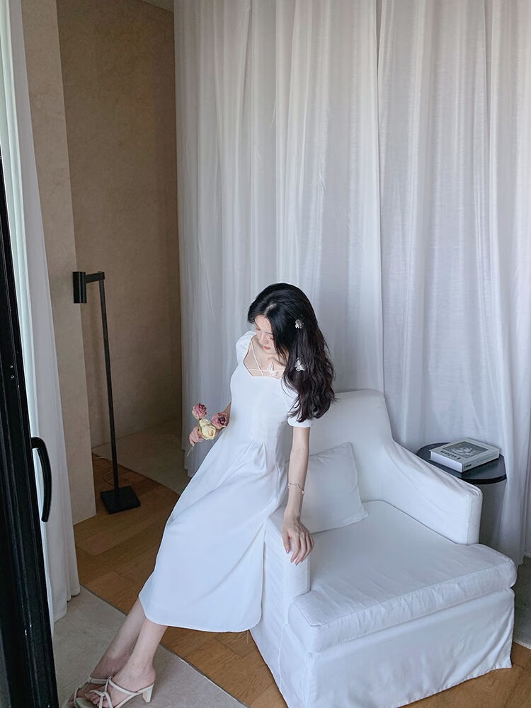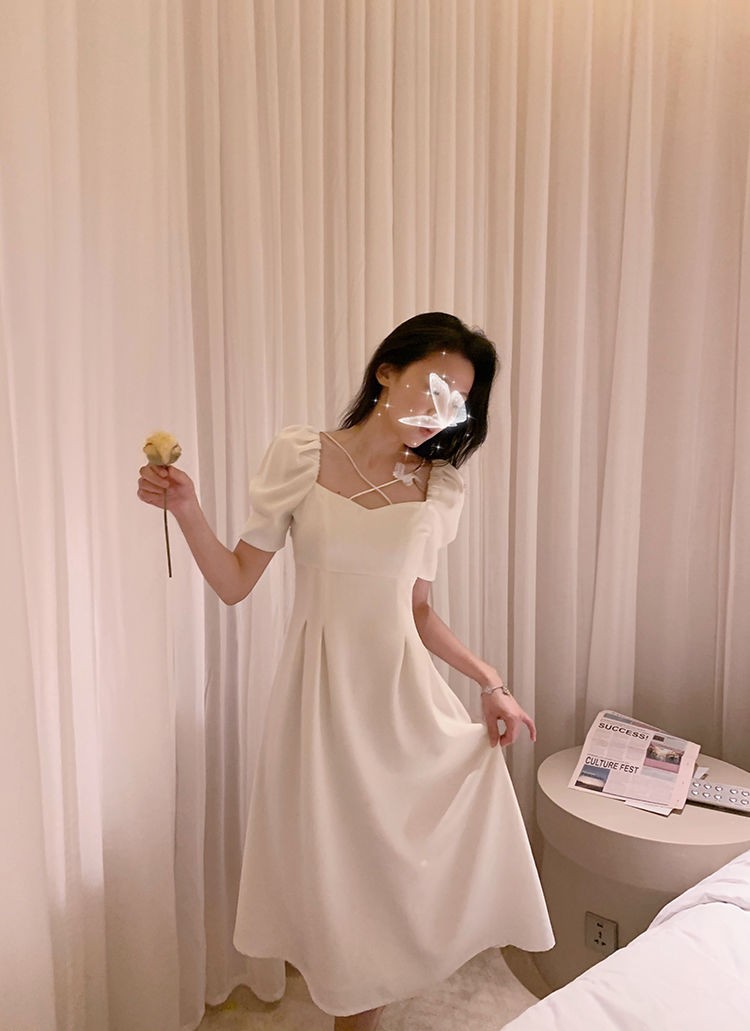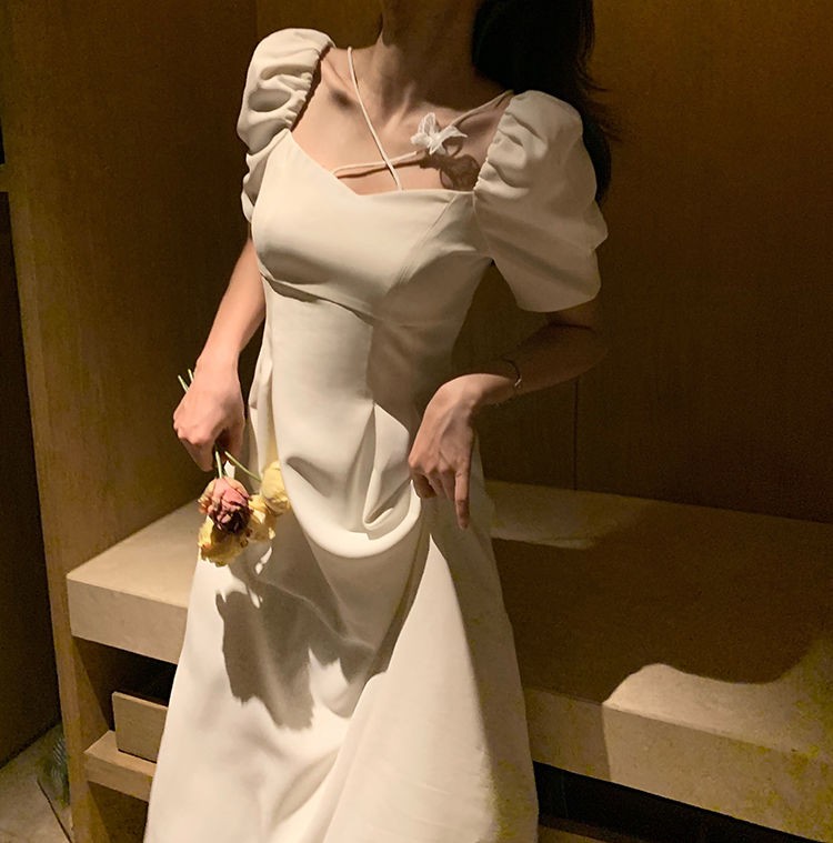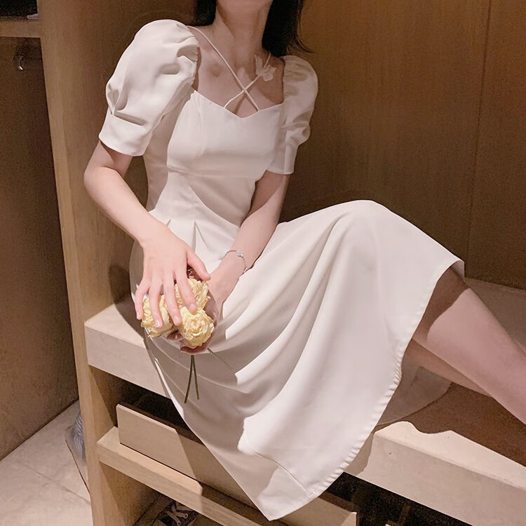 商品名称:YUDA春2021新款女法式白色初恋长裙仙女超仙森系泡泡袖方领气质连衣裙 白色 M(90-105斤)