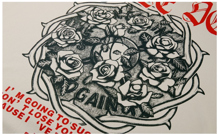 常规版的圆领设计、挺阔有型、穿着舒适、创意玫瑰印花,彰显个性突显你的魅力、双重缝合衣袖设计,品质保证不易掉,双层走线,耐穿耐磨