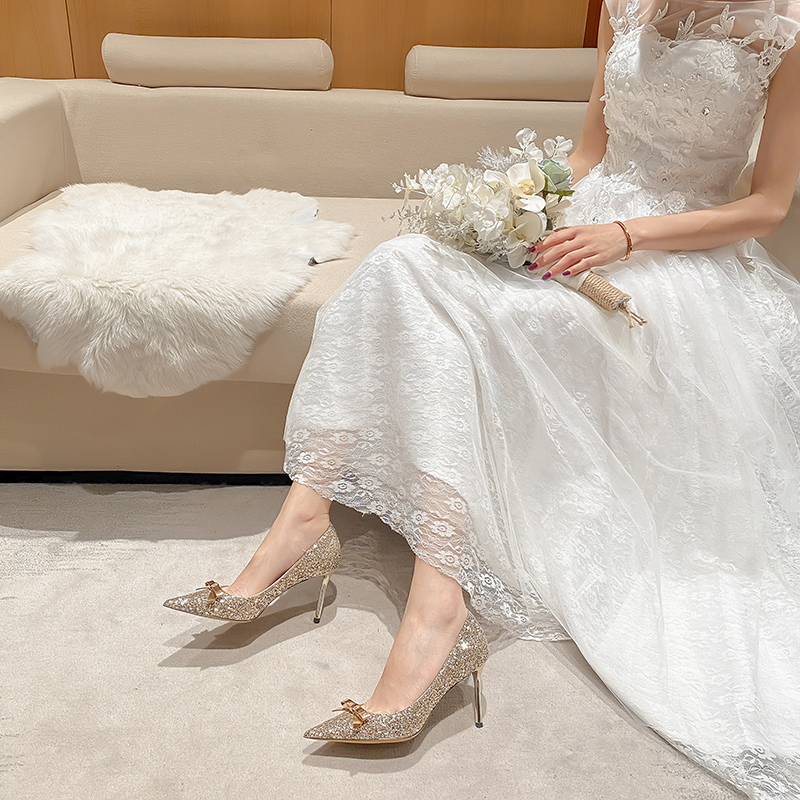 秀禾婚纱两穿婚鞋新娘鞋不累脚2021年春季新款高跟鞋女细跟水晶鞋
