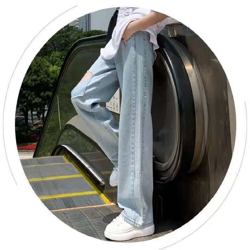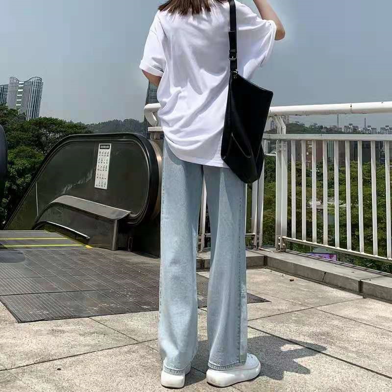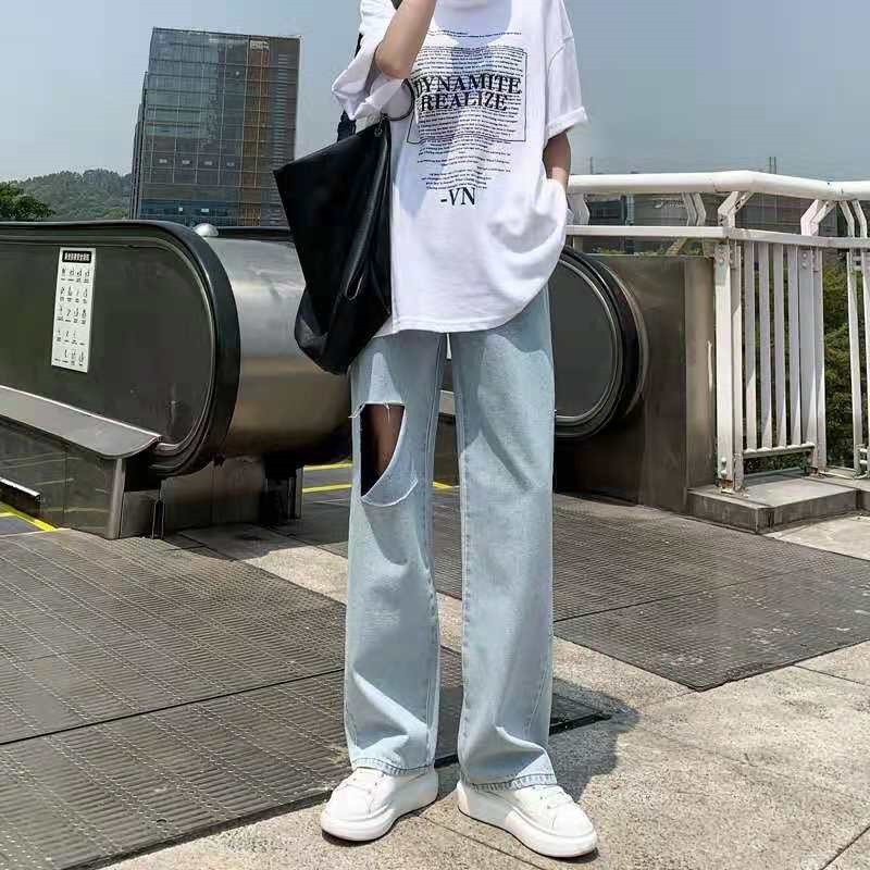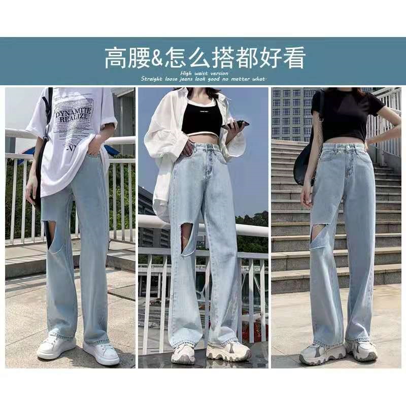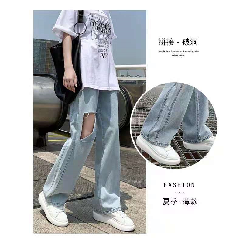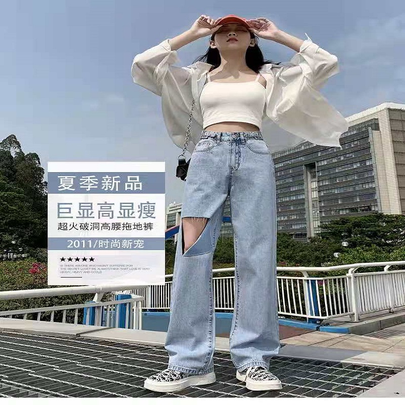 破洞牛仔裤女2021年新款夏季高腰显瘦直筒宽松阔腿小个子拖地裤薄