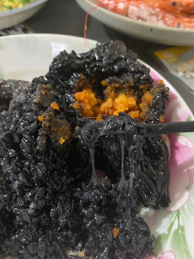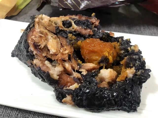 【配料】100%优质小圆糯、饮用水、南烛叶提取物、咸蛋黄、鲜肉、蜜枣、豆沙
