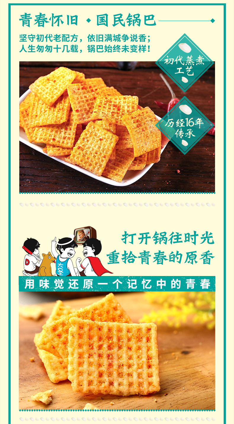口味: 混合装230g1盒 23g锅巴*1包口味随机 (拍一份发5包) 23g锅巴*1包口味随机(拍一份发5包) 72克藤椒火锅锅巴3包 72克香辣小龙虾味锅巴3包 72克蟹香蛋黄味锅巴3包 72克锅巴混合装*3(蟹咸蛋黄、藤椒火锅、香辣小龙虾各一包) 香辣小龙虾味23g*18包 藤椒火锅味23g*18包 蟹香蛋黄味23g*18包 香辣小龙虾+藤椒火锅味+蟹香蛋黄味混合装23g*18包 香辣小龙虾味23g*36包 藤椒火锅味23g*36包 蟹香蛋黄味23g*36包 香辣小龙虾+藤椒火锅味+蟹香蛋黄味混合装23g*36包 粗粮锅巴香葱味100g*3包 粗粮锅巴麻辣味100g*3包 粗粮锅巴番茄味100g*3包 黑米锅巴香葱味100g*3包 黑米锅巴香辣味100g*3包 黑米锅巴番茄味100g*3包