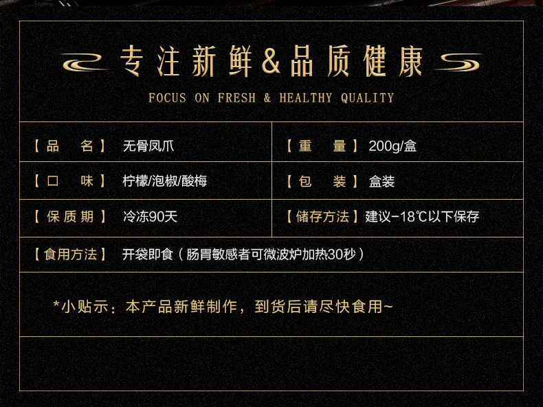 口味: 【 柠檬酸辣 】无骨凤爪 200g 【 柠檬加辣 】无骨凤爪 200g 【 泡椒中辣 】无骨凤爪 200g 【 柠檬酸辣 】无骨凤爪 500g [29.9元/盒] 【 柠檬加辣 】无骨凤爪 500g [29.9元/盒] 【 泡椒中辣 】无骨凤爪 500g [29.9元/盒] 【 柠檬酸辣 】无骨凤爪1000g [59.9元/盒] 【 柠檬加辣 】无骨凤爪1000g [59.9元/盒] 【 泡椒中辣 】无骨凤爪1000g [59.9元/盒]