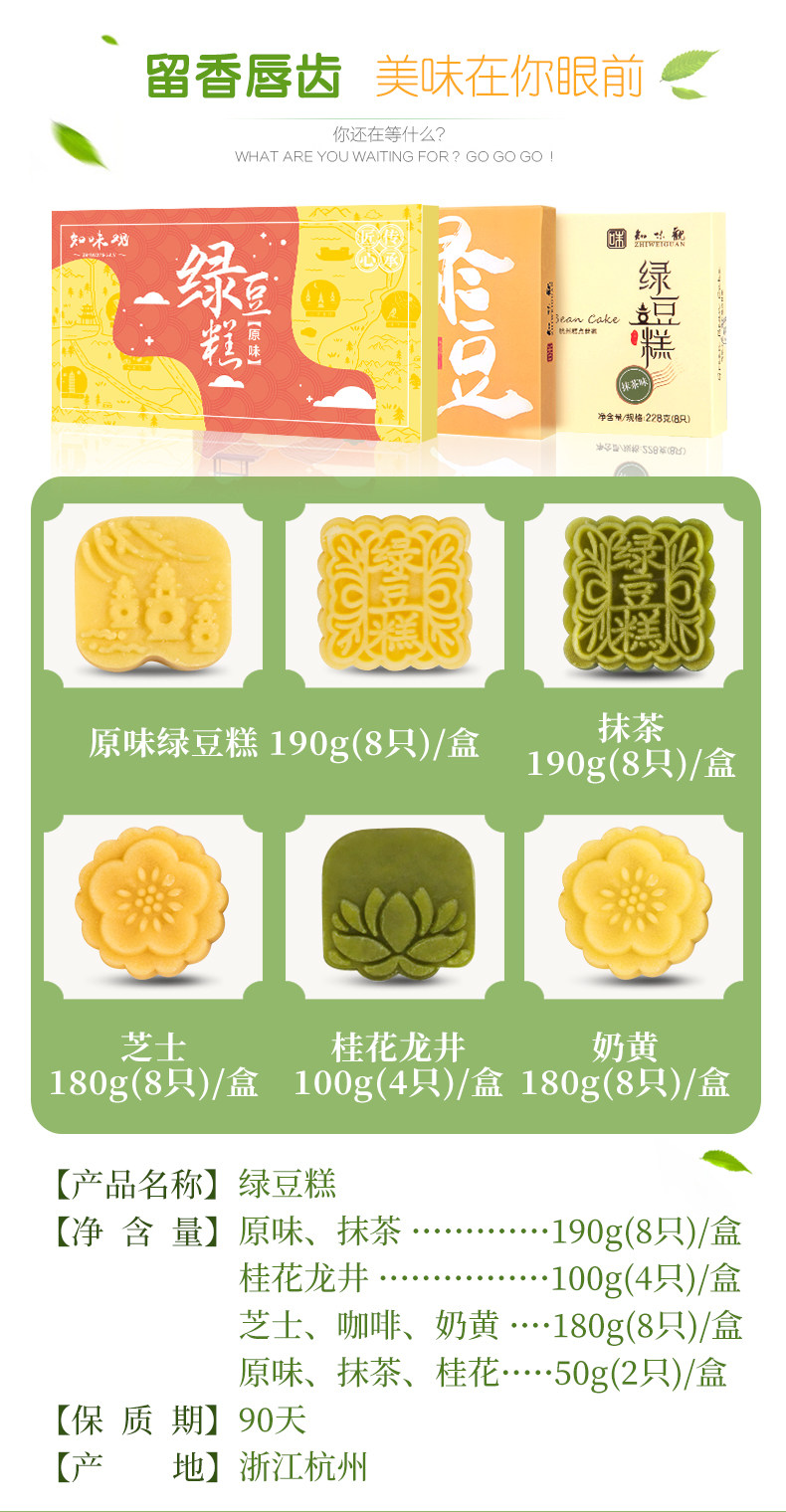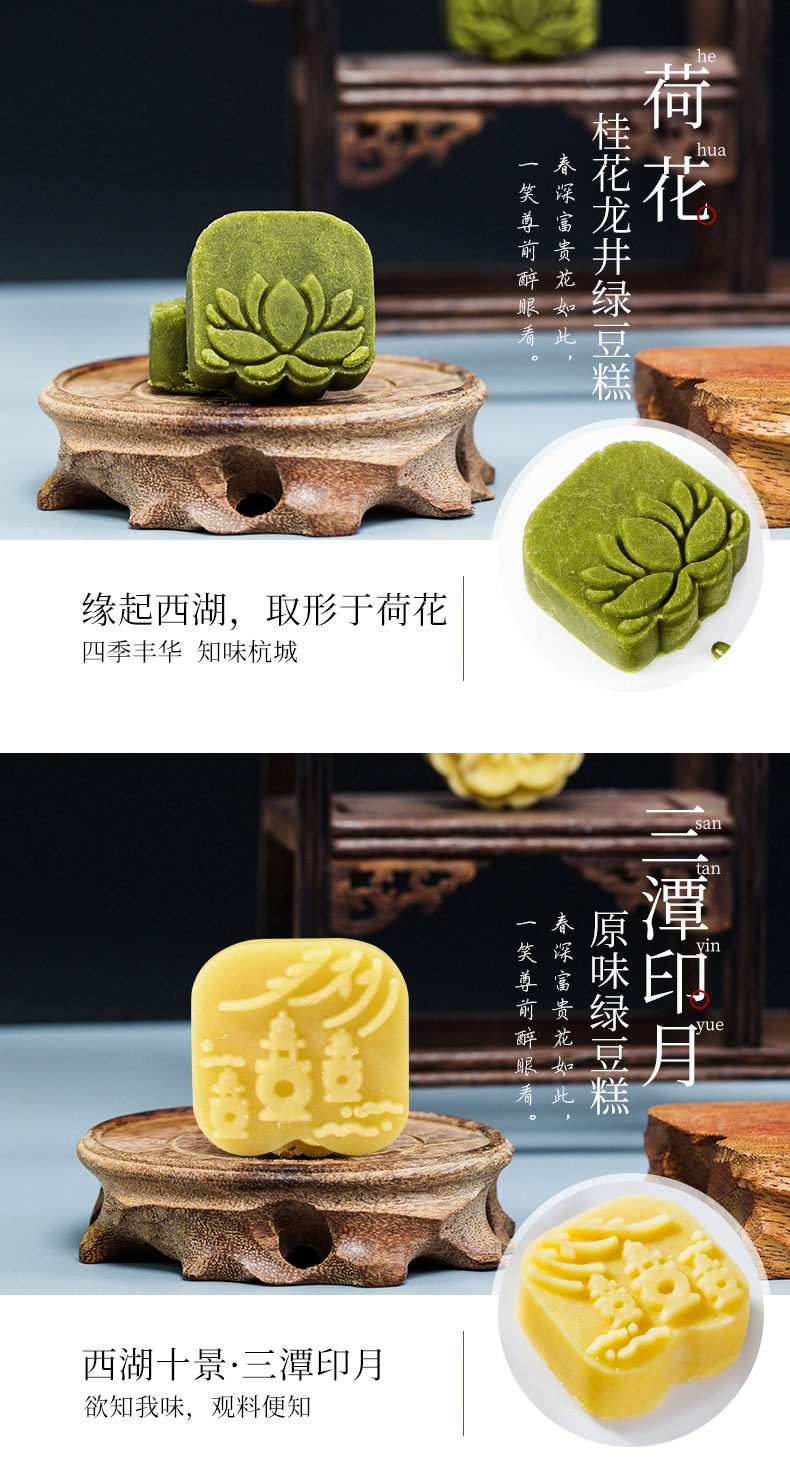 口味: 【萌新必选】抹茶50克+原味50克 【江南回味】桂花龙井绿豆糕100克(荷花造型) 网红推荐】桂花龙井茶100克+原味50克+抹茶50克 【主播推荐】原味190克+桂花50克 【清凉降暑】抹茶190克+原味50克(三潭映月造型) 【颜值推荐】芝士蔓越莓幸福双76克+桂花龙井100克(幸福成双好口彩)