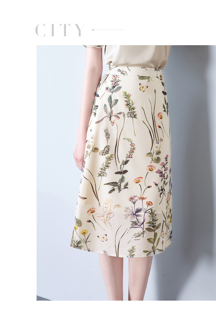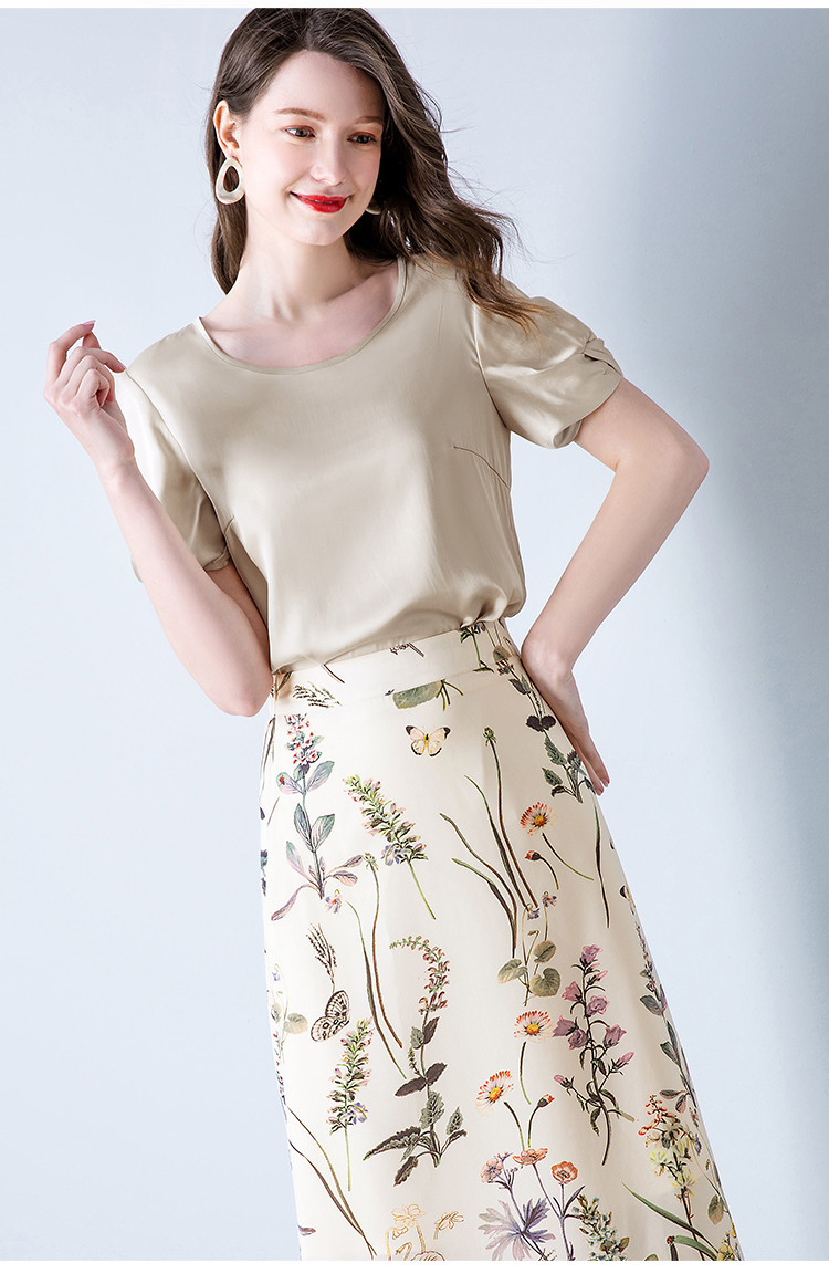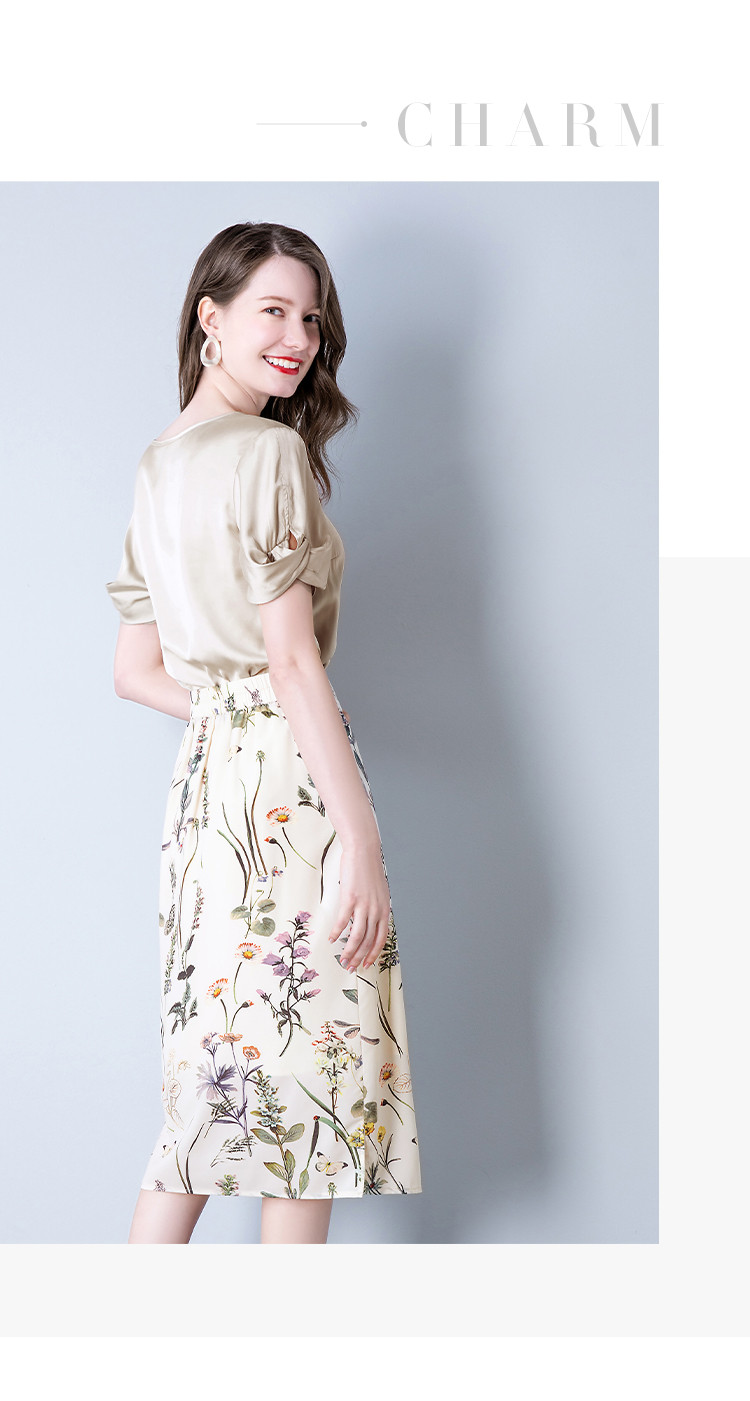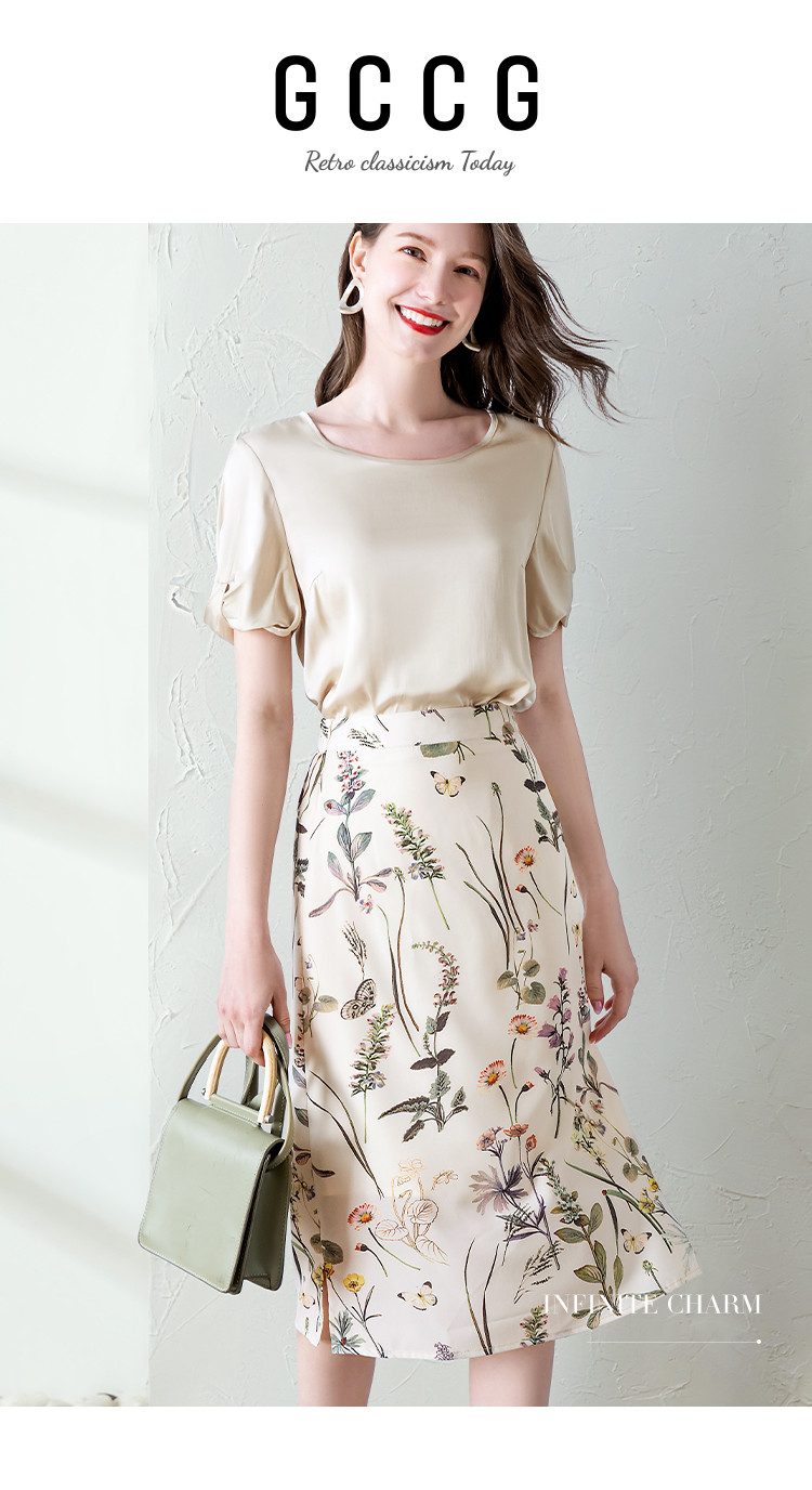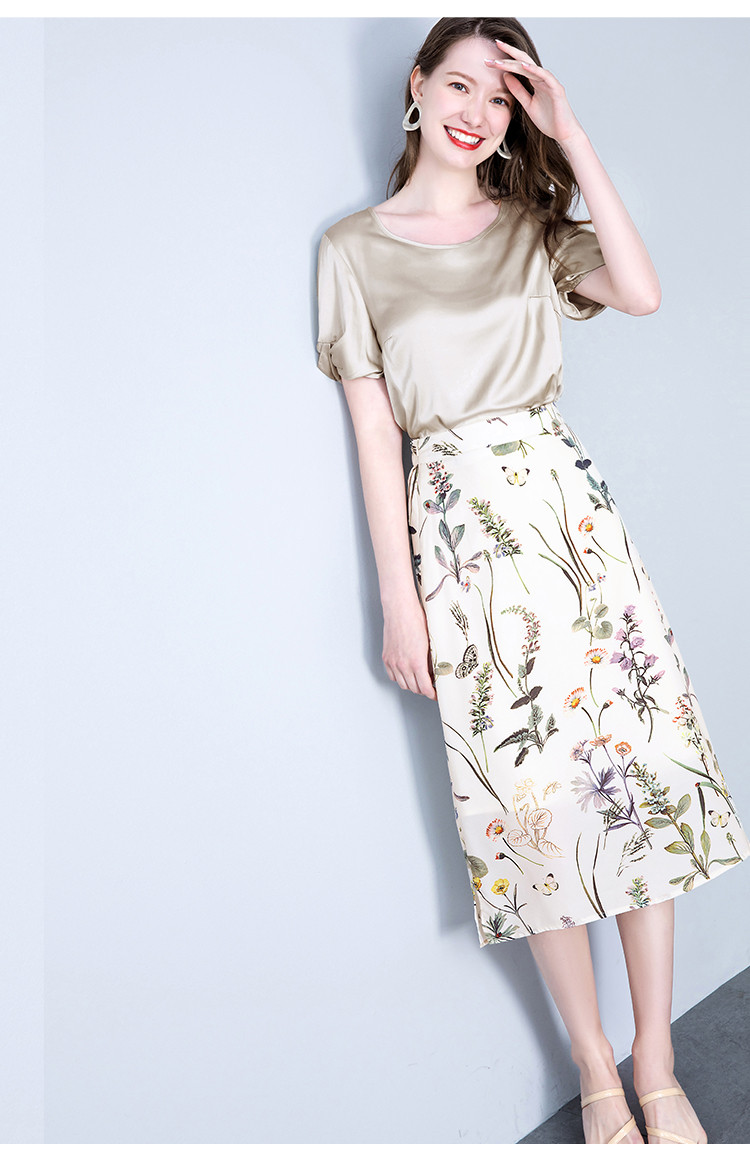 气质名媛风缎面T恤碎花高腰半身包臀裙套装