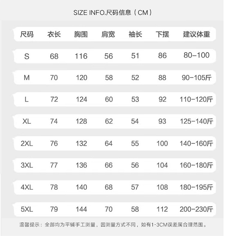尺码: XL(120-140斤) S(90-100斤) M(95-110斤) 2XL(140-160斤) 3XL(160-180斤) 4XL(180-200斤) 5XL(200-230斤) L(110-130斤)