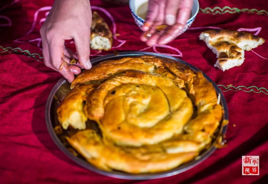 “卡特玛”:汉译名为烤酥油卷。把和好的面团擀薄,将奶皮子或酥油在面上抹均匀,卷成长条,然后盘成圆形,放在锅内用文火烙烤,两面烤成桔黄色即可食用。另一种做法是将和好的面团,切成数等份,擀成数张薄饼,然后抹上油,一张张地叠起来,放在锅内文火烙烤成桔黄色即可。这种食品,外酥里软,香味浓郁,是待客的上乘食品。