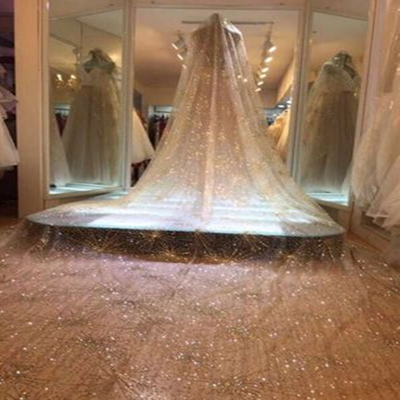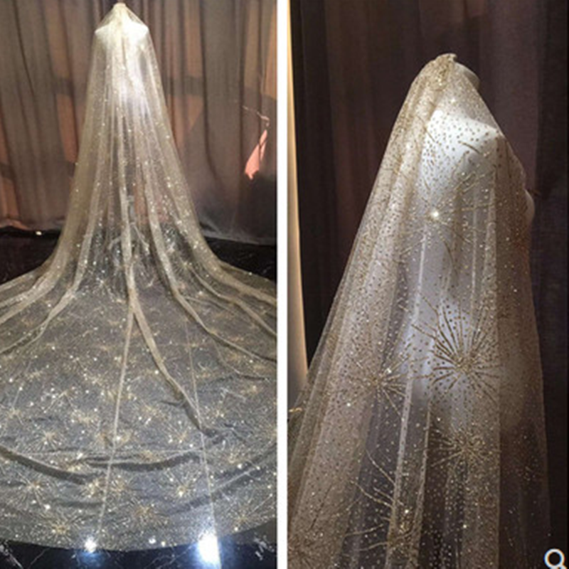 新款星光闪亮复古香槟金色头纱超长拖尾结婚新娘奢华婚纱礼服配饰