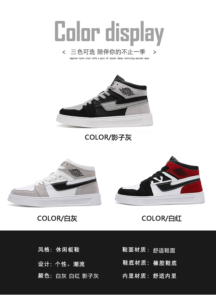 颜色分类: 灰色高帮 白色高帮 白黑高帮 黑红高帮 闪电蓝高帮 杏橙高帮 脏粉高帮 炫彩蓝高帮 冰蓝高帮 影子灰高帮 黑桔高帮 果绿高帮 炫彩灰高帮 云朵蓝高帮 荷兰绿高帮 红豆奶茶高帮 黑白灰高帮 灰色加棉高帮 蓝色加棉高帮 果绿加棉高帮 冰蓝加棉高帮