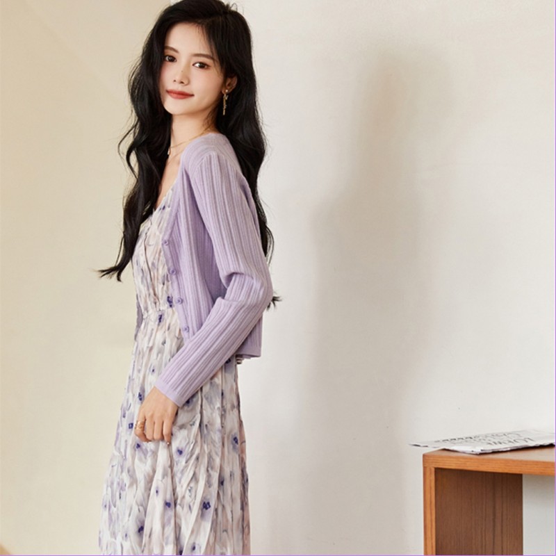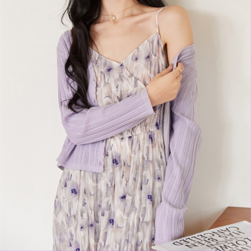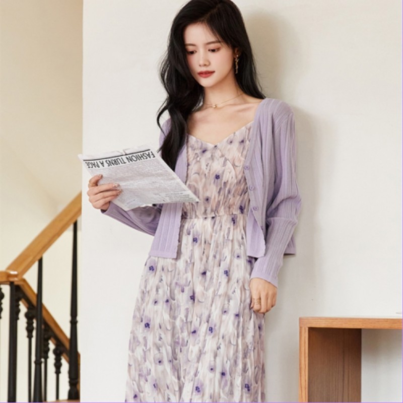 夏季新款茶歇温柔风超仙裙子法式高级感碎花吊带连衣裙紫色针织衫两件套装女 碎花裙 S