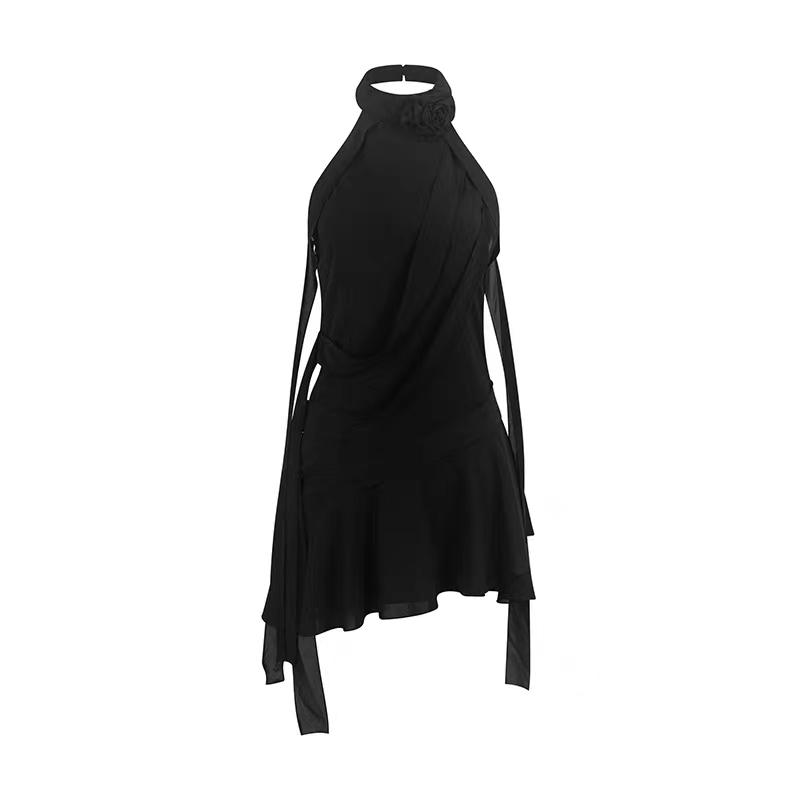定制同面料包扣精致可爱,可拆卸玫瑰绽放颈间,露背连衣裙塑造点到为止的轻熟都市女子气息。