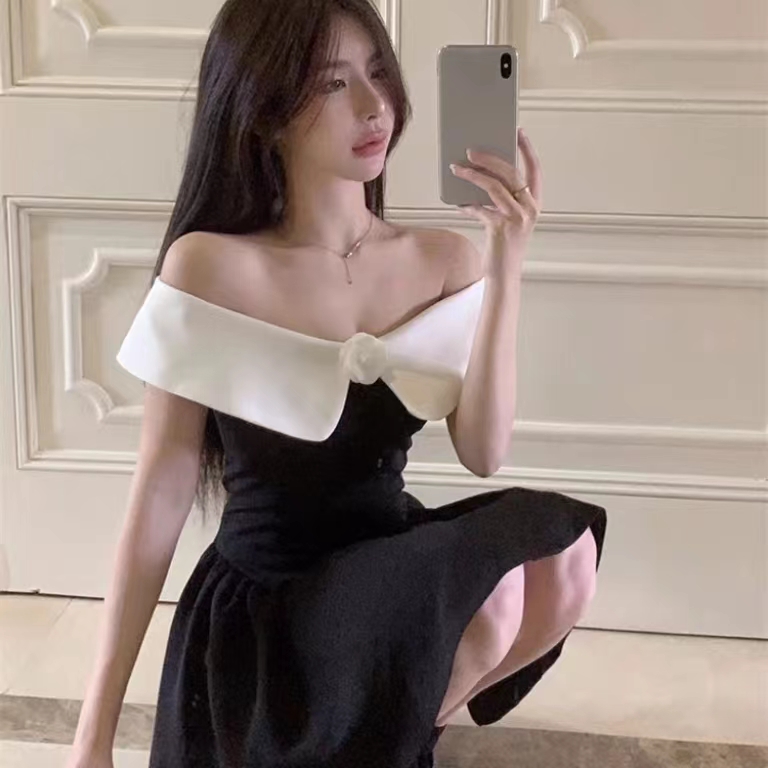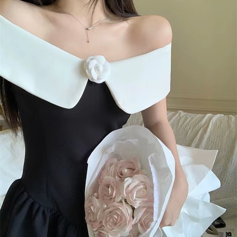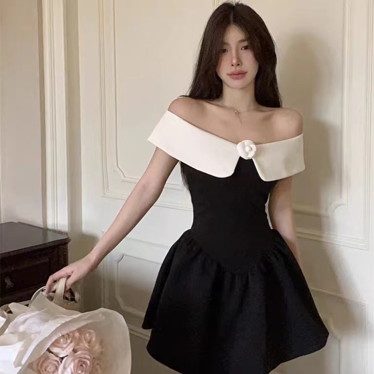 法式撞色一字肩连衣裙女夏季黑色裙子花朵高级感气质收腰a字短裙 S 黑